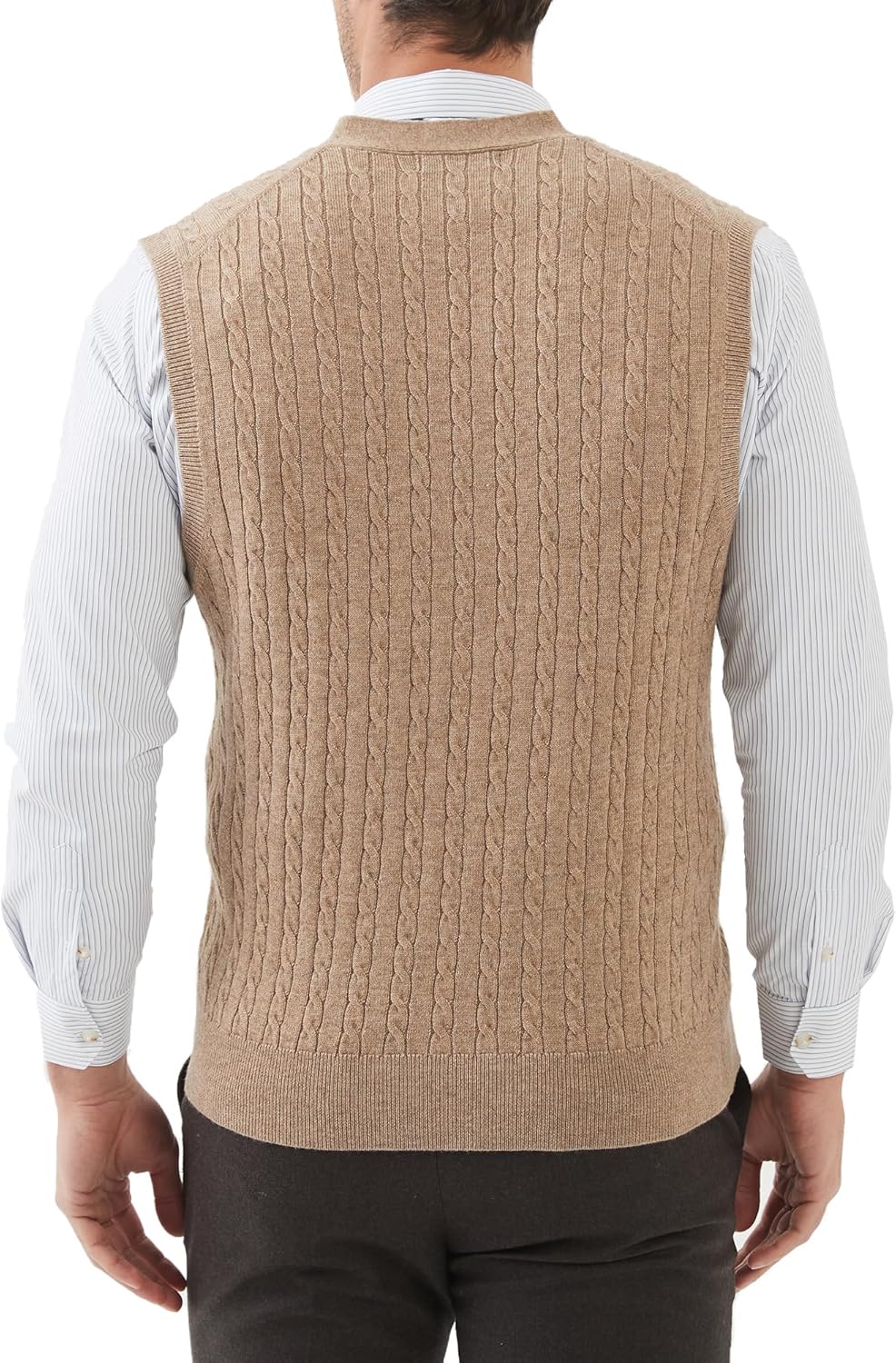 - EIGENSCHAFTEN: Wollemischung, V-Ausschnitt-Weste ohne Ärmel, mit Knopfverschluss, Zopfmuster, Relax fit, Rippbündchen, basic & classic Design