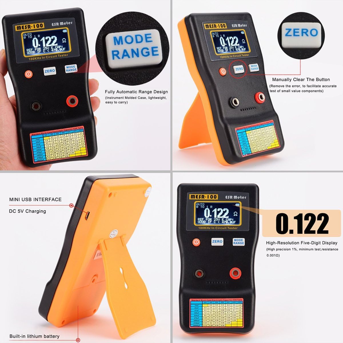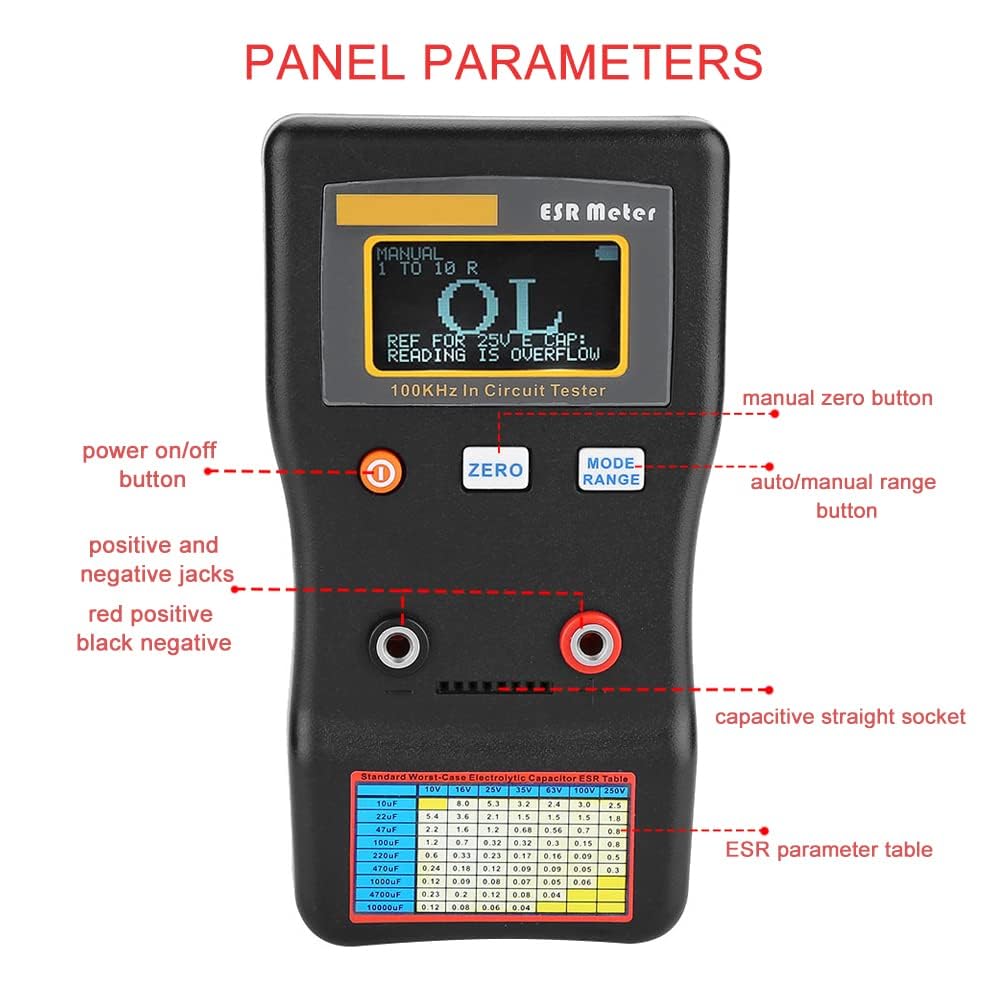 - ★ Hohe Präzisionsmessung - Der Messbereich des ESR Kapazitätsmesser reicht von 0,001 bis 100,0 R mit einer hohen Genauigkeit von 1 % und unterstützt die Messung in der Leitung.