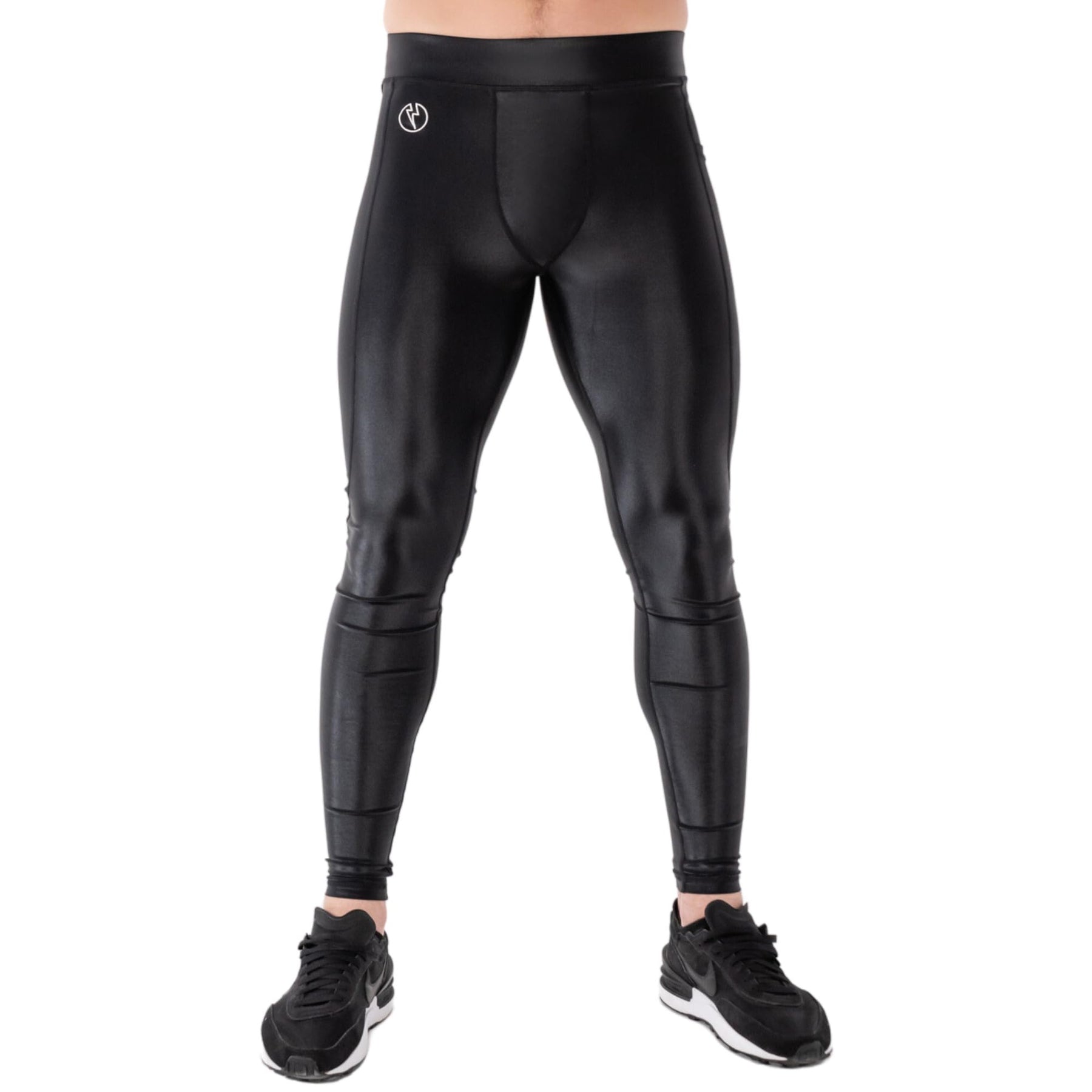 - Omega Performance Leggings: Du bist die Nacht. Schwarze hochglänzende Kompressionsleggings für Männer mit Metallic-Schimmer