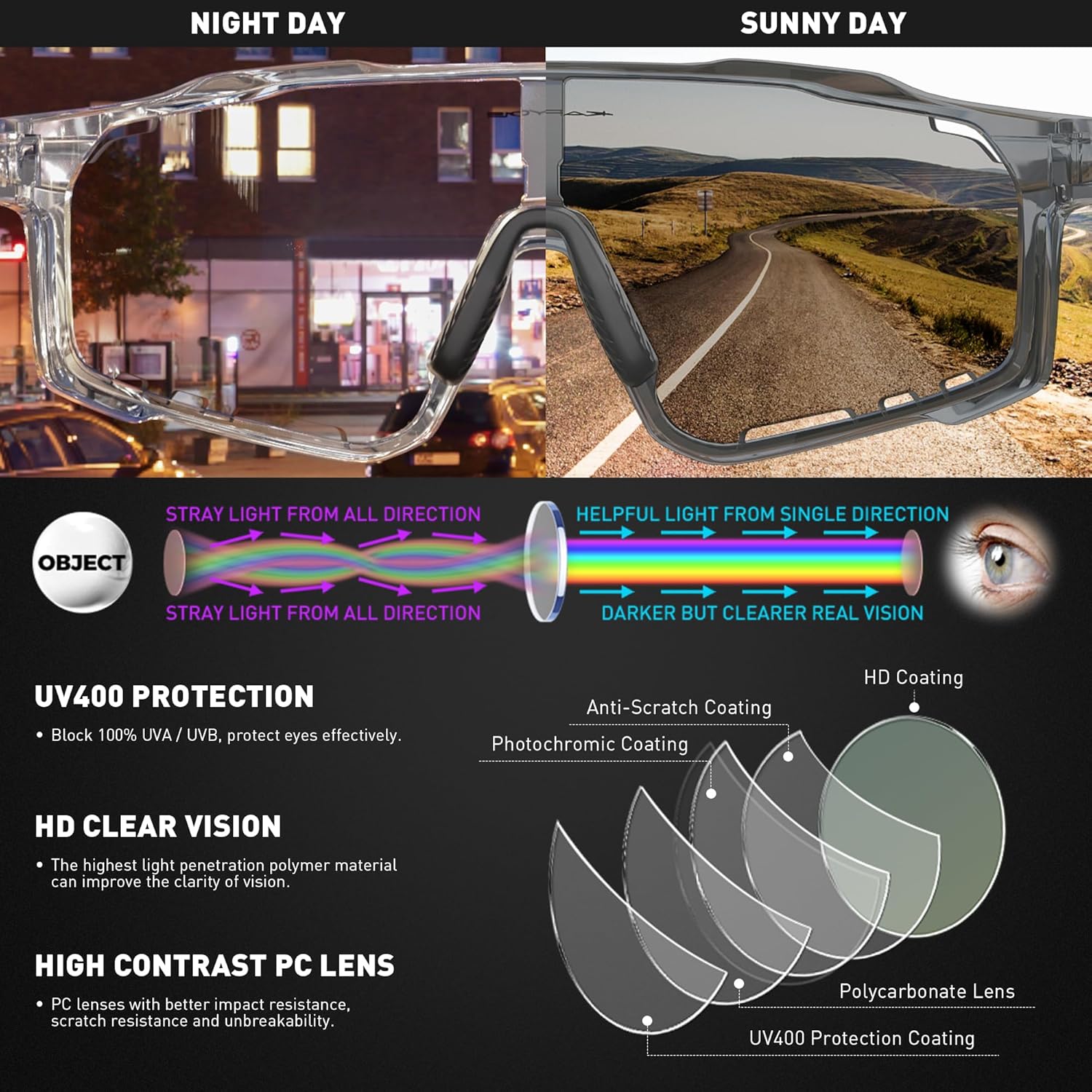 • 【Selbsttönende Vollrahmen-Technologie】Diese Fahrradbrille verfügt über eine innovative selbsttönende Technologie, bei der die Gläser und der Rahmen je nach Intensität des UV-Lichts dynamisch von klar zu Verdunkelt wechseln, um die Augen vor