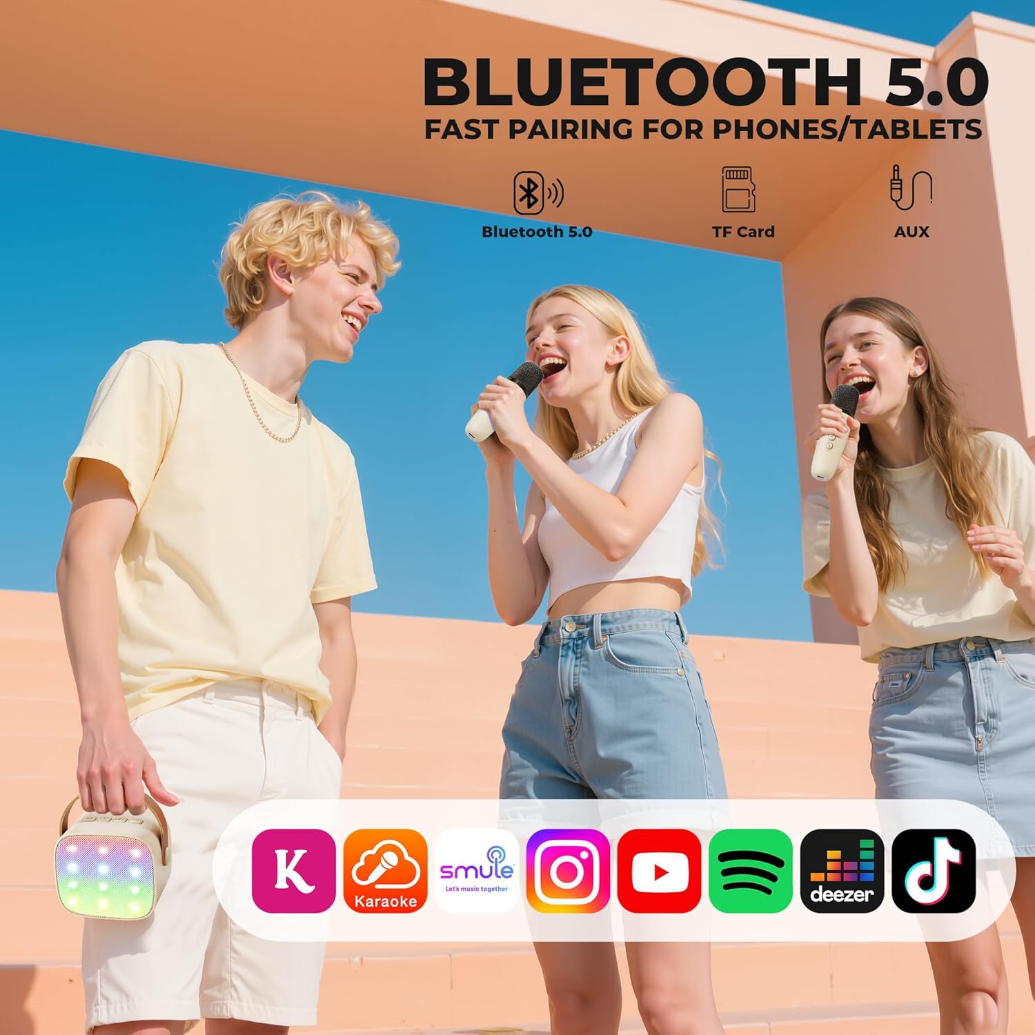 - 【Einfache Bedienung & Lange Akkulaufzeit】Verbinden Sie sich mit jedem Smartgerät in Sekundenschnelle mit Bluetooth, AUX-Eingang und TF-Karten-Unterstützung. Der eingebaute Akku sorgt dafür, dass die Bluetooth-Karaoke etwa 4-6 Stunden lang Musik
