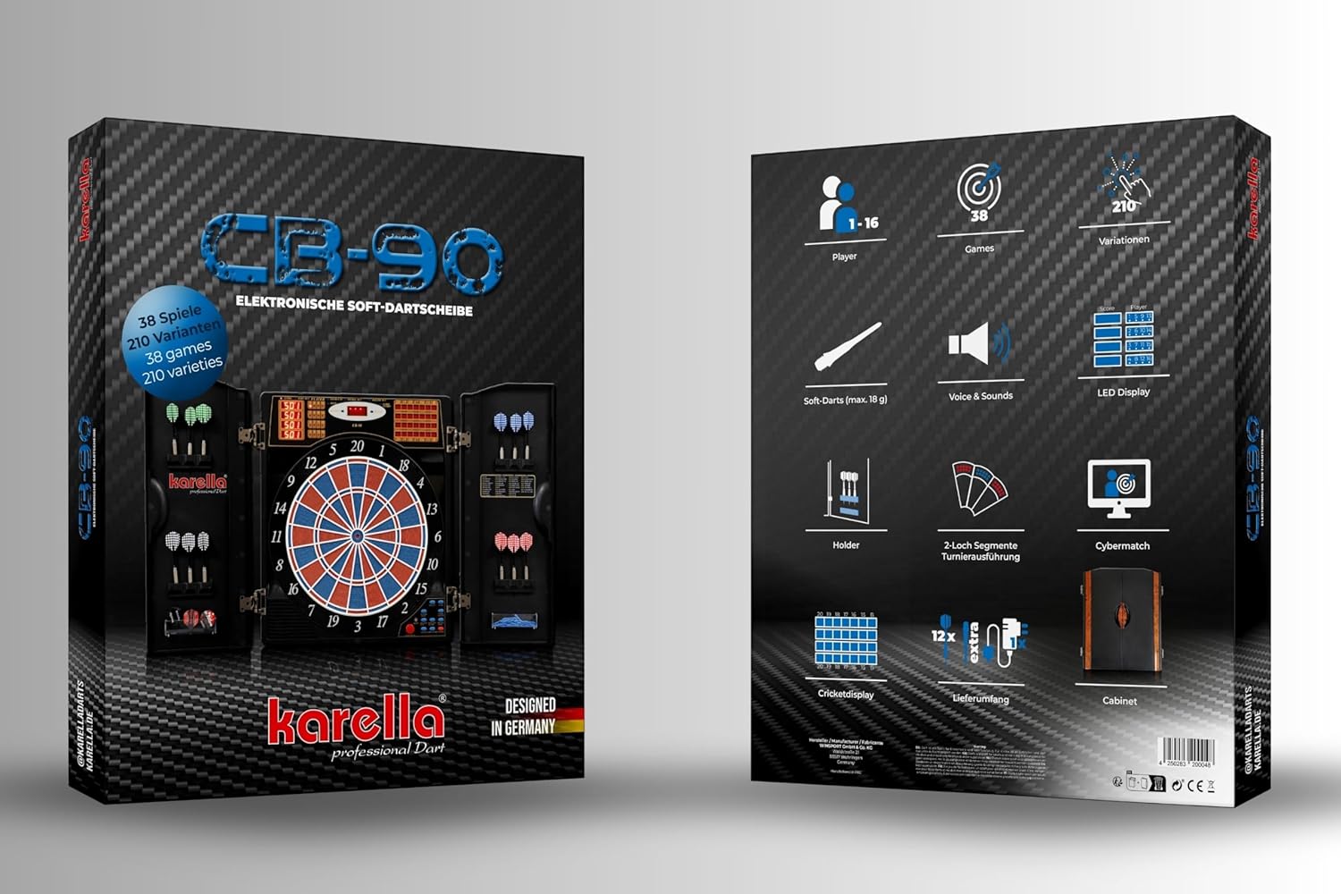 - Funktionen: Douple In/Out (mit Anzeige), Master Out, Cybermatch (5 Schwierigkeitsstufen), Tastatursperre, Fehlwurflösch-Option