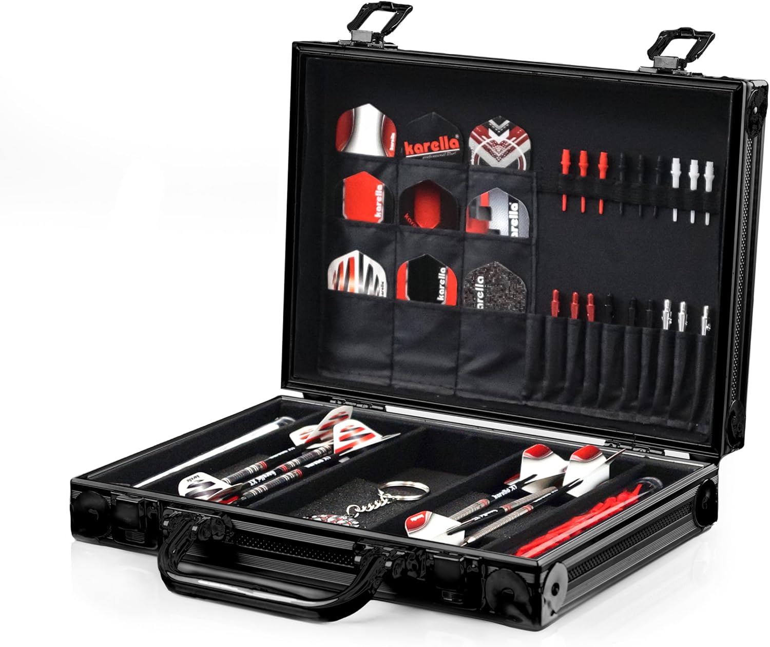 - Ausreichend Platz für 4 vollmontierte Sets Darts, sowie genügend Zubehör; schwarzes & schlichtes Design