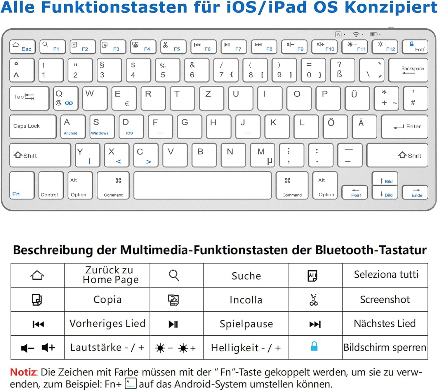 - 【Breite Kompatibilität】 Die Bluetooth-Tastatur funktioniert gut mit drei Betriebssystemen (iOS, Android und Windows), einschliesslich iPad 10.9/iPad 10.2/iPad 9.7/iPad Air/iPad Pro/iPad Mini/Tablet/iPhone/Smartphone/Laptop und mehr Bluetooth-fähige