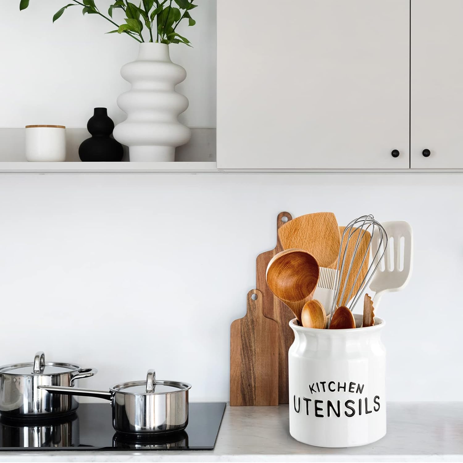 - Küchenutensilienhalter: Dieser Keramik-Utensilientopf hat eine glänzende Glasur und einen geprägten Text, um ihn glänzend und leicht sauber zu halten, hält langem täglichen Gebrauch stand.