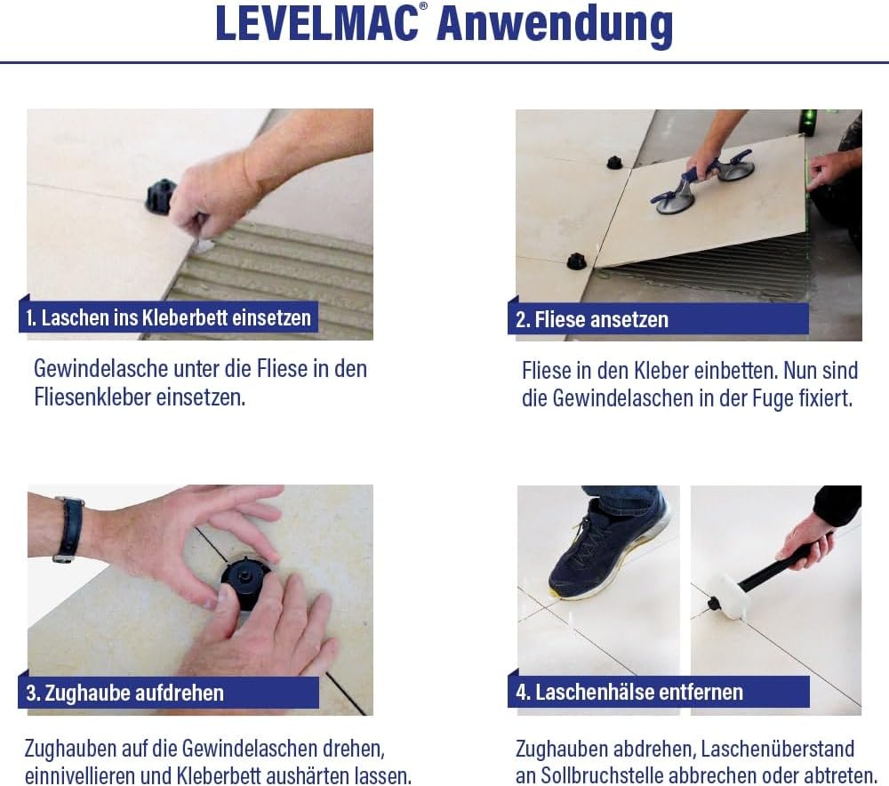 - LEICHTE ANWENDUNG: Die Zuglaschen beim Verlegen unter die Fliesen schieben. Anschliessend die wiederverwendbaren Zughauben aufdrehen und somit fixieren. Nach dem Aushärten Zughauben abschrauben & Laschen an Sollbruchstelle abtrennen.
