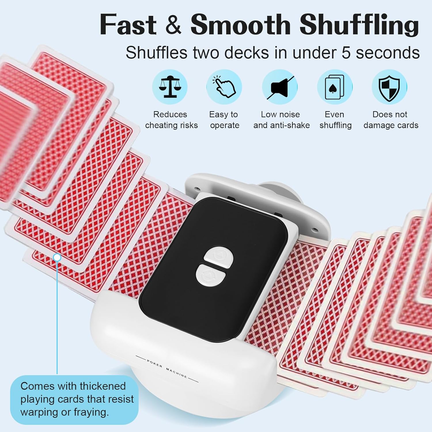 - 【Schnell, reibungslos und geräuscharm】Mit qualitativ hochwertigen Schrägverzahnungsgetrieben und einem geräuscharmen Motor mischt es 1 bis 2 Kartenspiele in nur 3 Sekunden reibungslos. Durch den leiseren Betrieb können Sie sich ohne Ablenkungen
