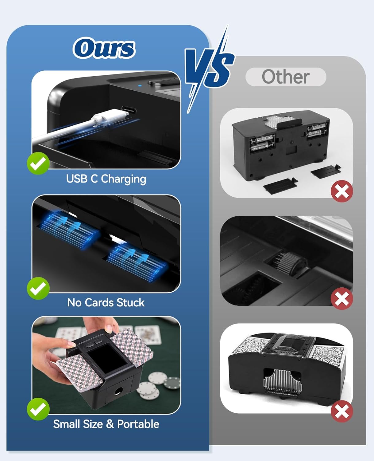 - [Schneller, Leiser] - Die Mischzeit eines Kartenspiels wird von 4 Sekunden auf 2 Sekunden reduziert. Gleichzeitig reduziert der neue Motor den Geräuschpegel von 110 auf 65 Dezibel. Geniessen Sie sanftes, leises Mischen. Ermöglicht es Ihnen, sich auf