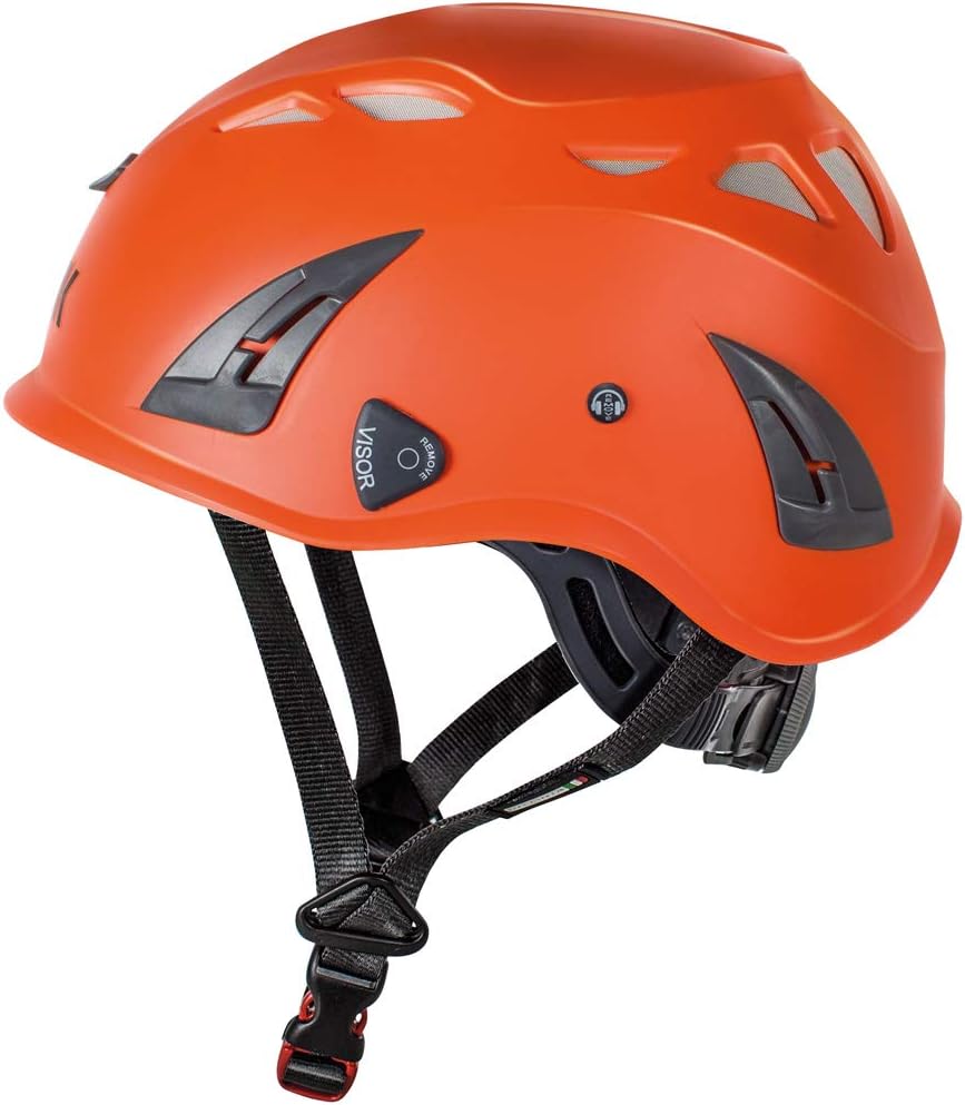 - Der Helm kann zusätzlich mit abnehmbaren Clips aus Acetal für die Befestigung von Kopflampen mit elastischem Band ausgestattet werden