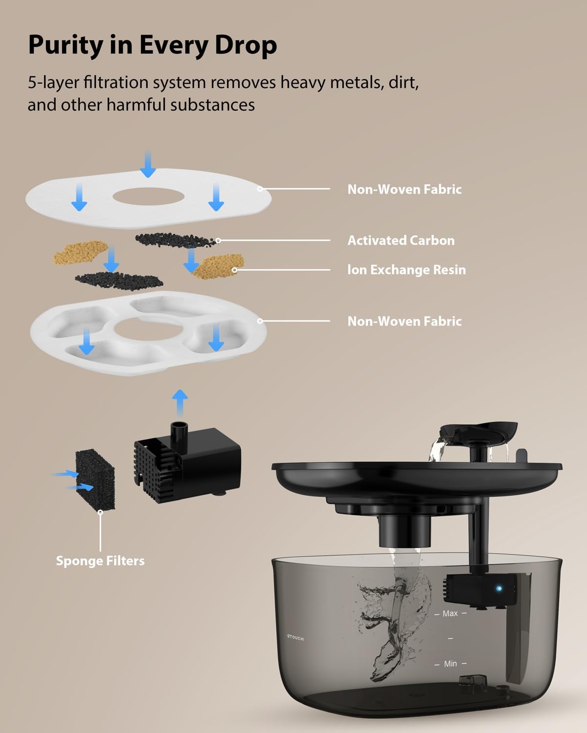- 【Mehrfaches Filtersystem】:Katzenbrunnen verfügt über ein Multifiltersystem, das aus einer Baumwollschicht, Aktivkohle aus Kokosnussschalen und Ionenaustauschharz besteht. Zusammen mit dem Pumpenfilter bildet es ein leistungsfähiges Filtersystem
