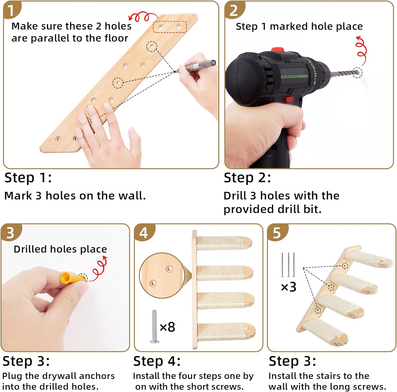 - 🐈 WANDMONTIERTER KATZENBAUM - Sicher und stabil. Es werden nur 2 Löcher für die Dübel benötigt und die Katzenregale an die Wand geschraubt und die Installation abgeschlossen