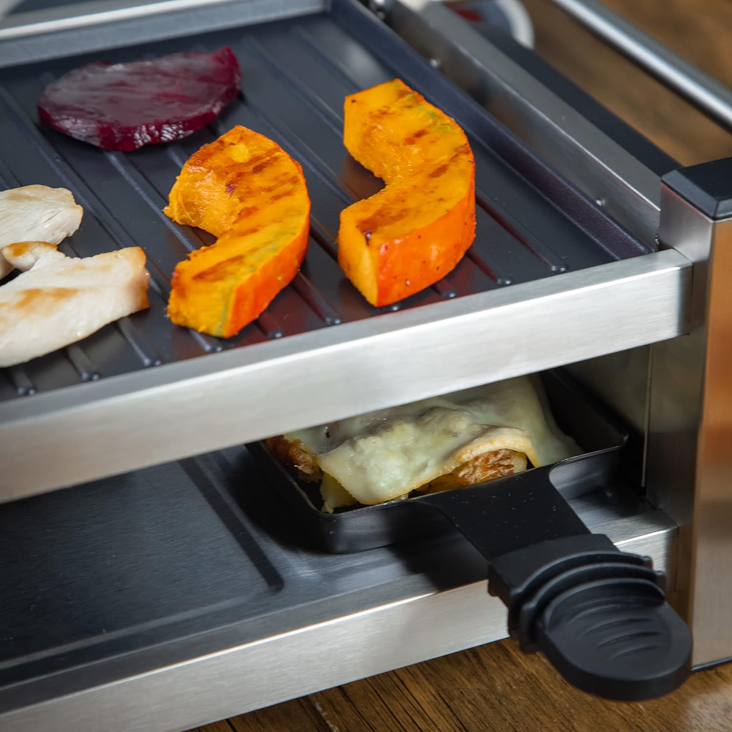 - LIEFERUMFANG: Raklettgerät 4 Personen, Antihaftbeschichtete Grillplatte, 4 Raclettepfännchen, 4 Raclette Schaber, Bedienungsanleitung inkl leckeren Rezepten