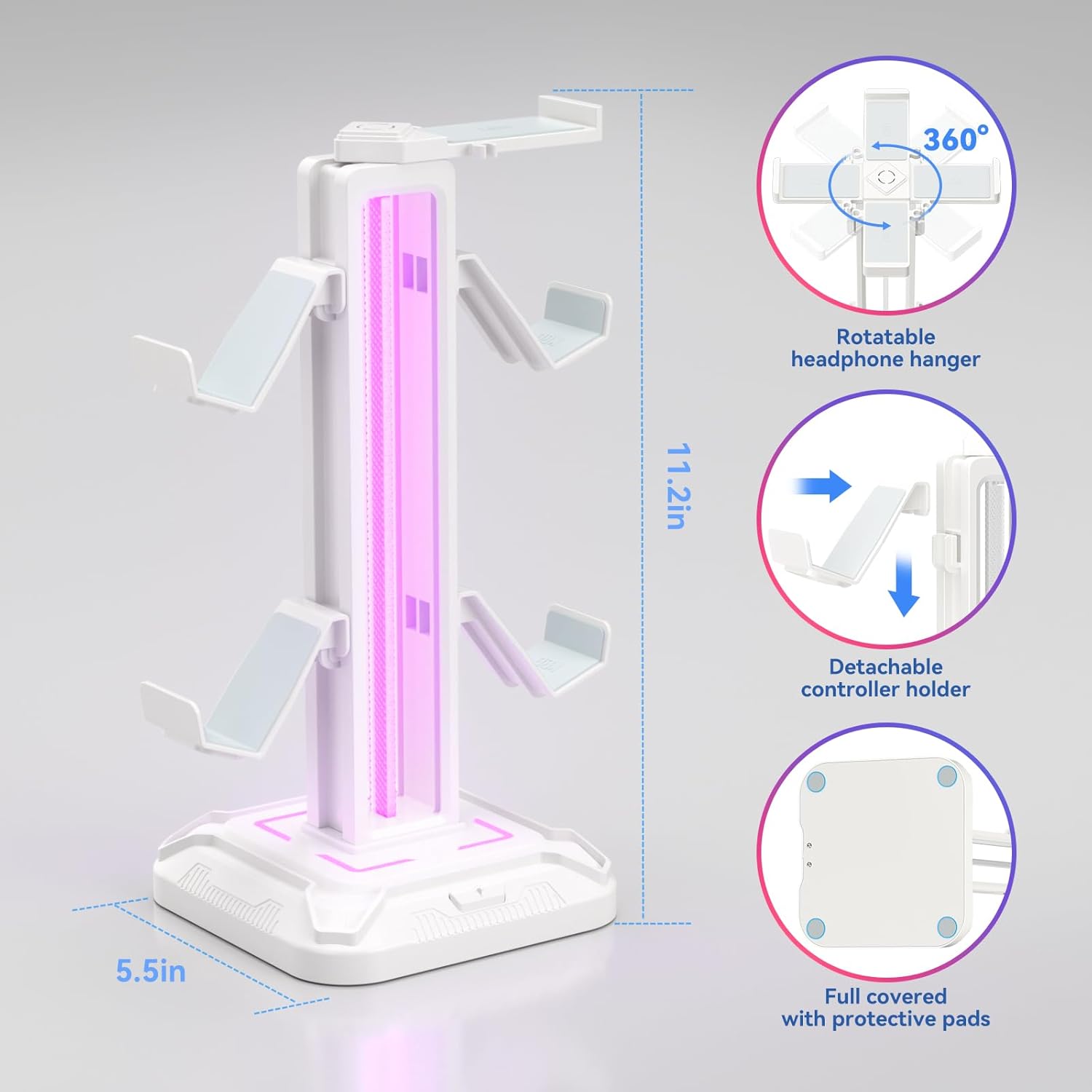 - 【Abnehmbarer Controller Halter & Drehbarer Kopfhörerständer】 Dieser Gaming Headset Ständer LED kann einen Kopfhörer und zwei Controller gleichzeitig halten, oder vier Gamer Controller. Der Gaming Kopfhörerständer passt auf Kopfhörergrössen