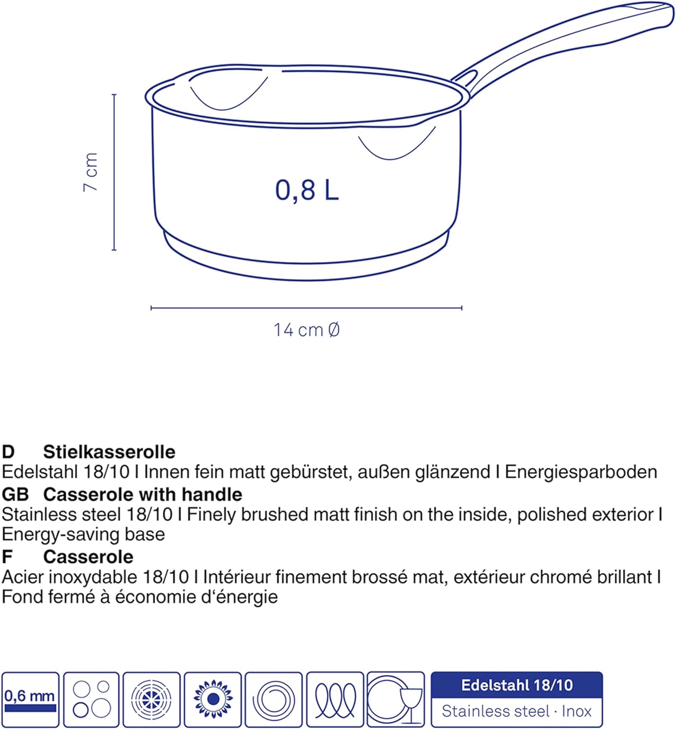 • Klassischer Stil, praktisch in der Handhabung: Elegante Stielkasserolle in Glanzoptik mit 0,8 l Fassungsvermögen für kleine Gerichte, Suppen oder zum Aufwärmen von Milch