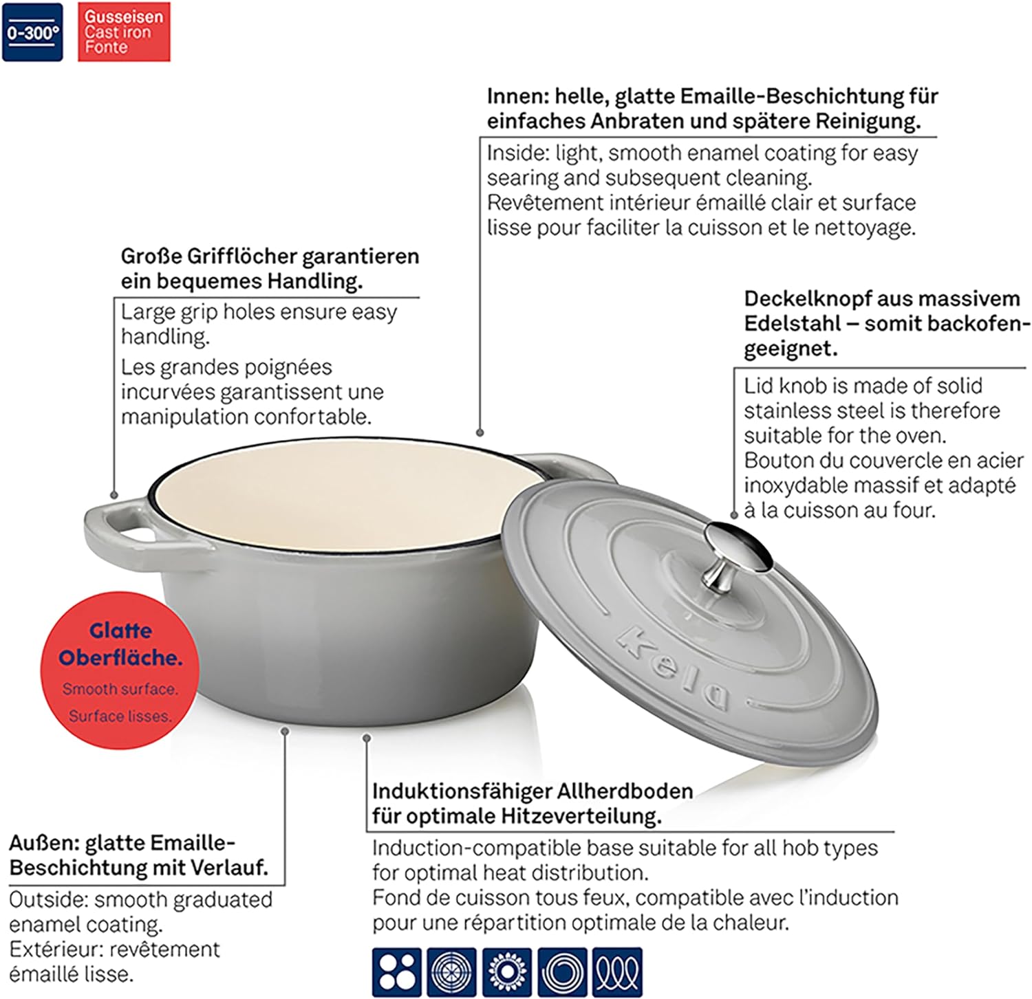 - Lieferumfang: 1x kela Bräter, Calido, 12605, Gusseisen, 2,5 L, Rund, Masse: Ø 21 cm, Höhe 10 cm