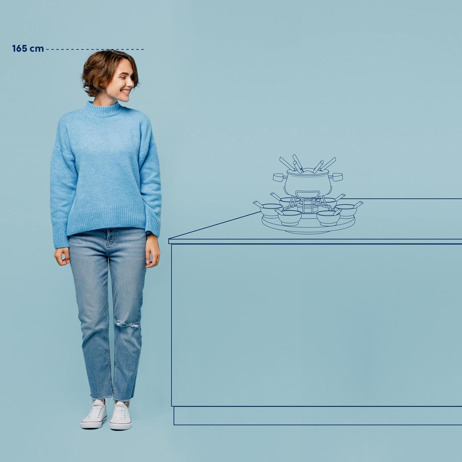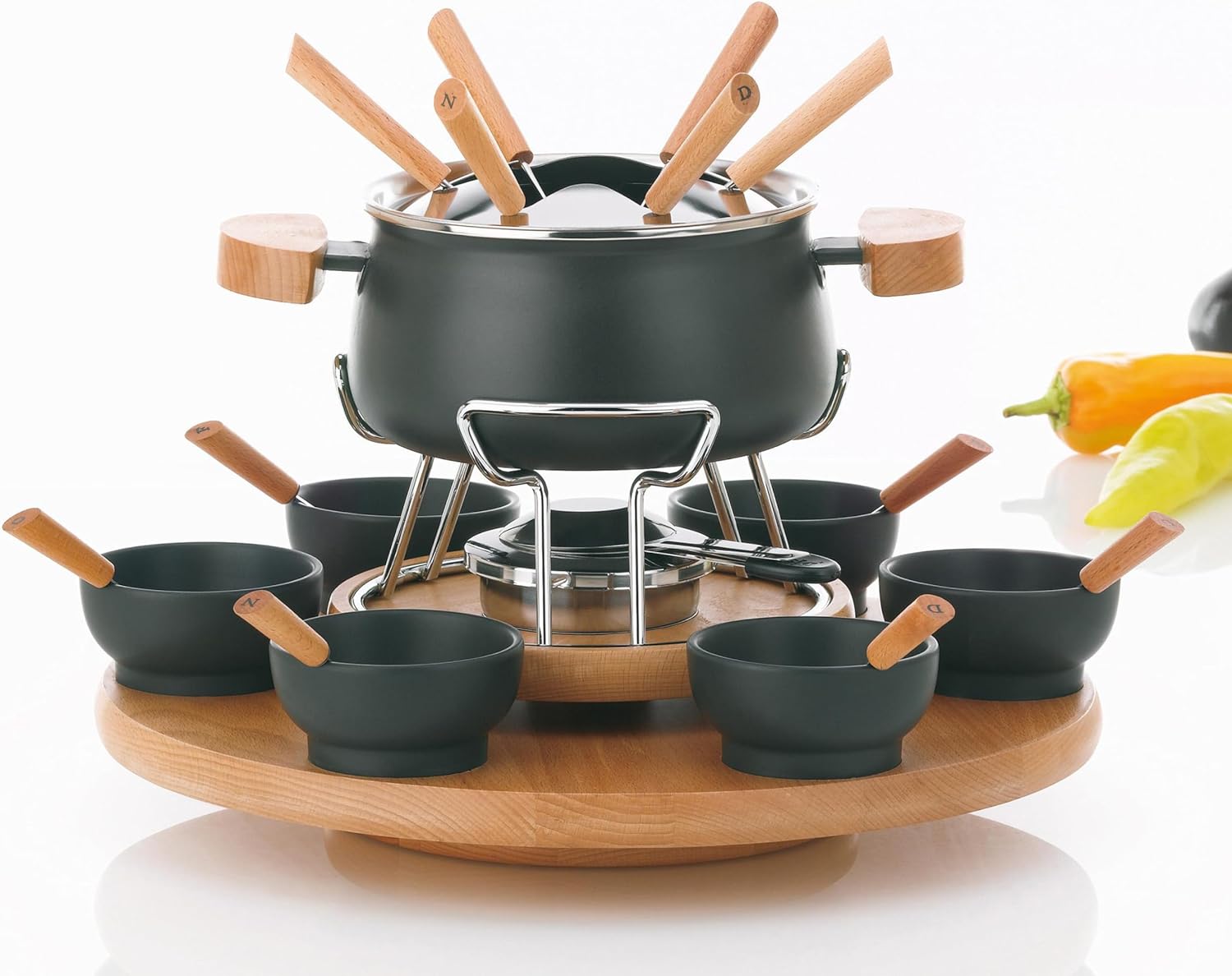 - Kein lästiges Herumreichen der Dips und Kleinigkeiten: Drehbares Gestell mit sechs Keramikschalen und Löffeln, Kabellose Bedienung: Kein störendes Kabel auf dem Tisch, Markierung der Käsefonduegabeln durch je einen Buchstaben vom Wort „Fondue“