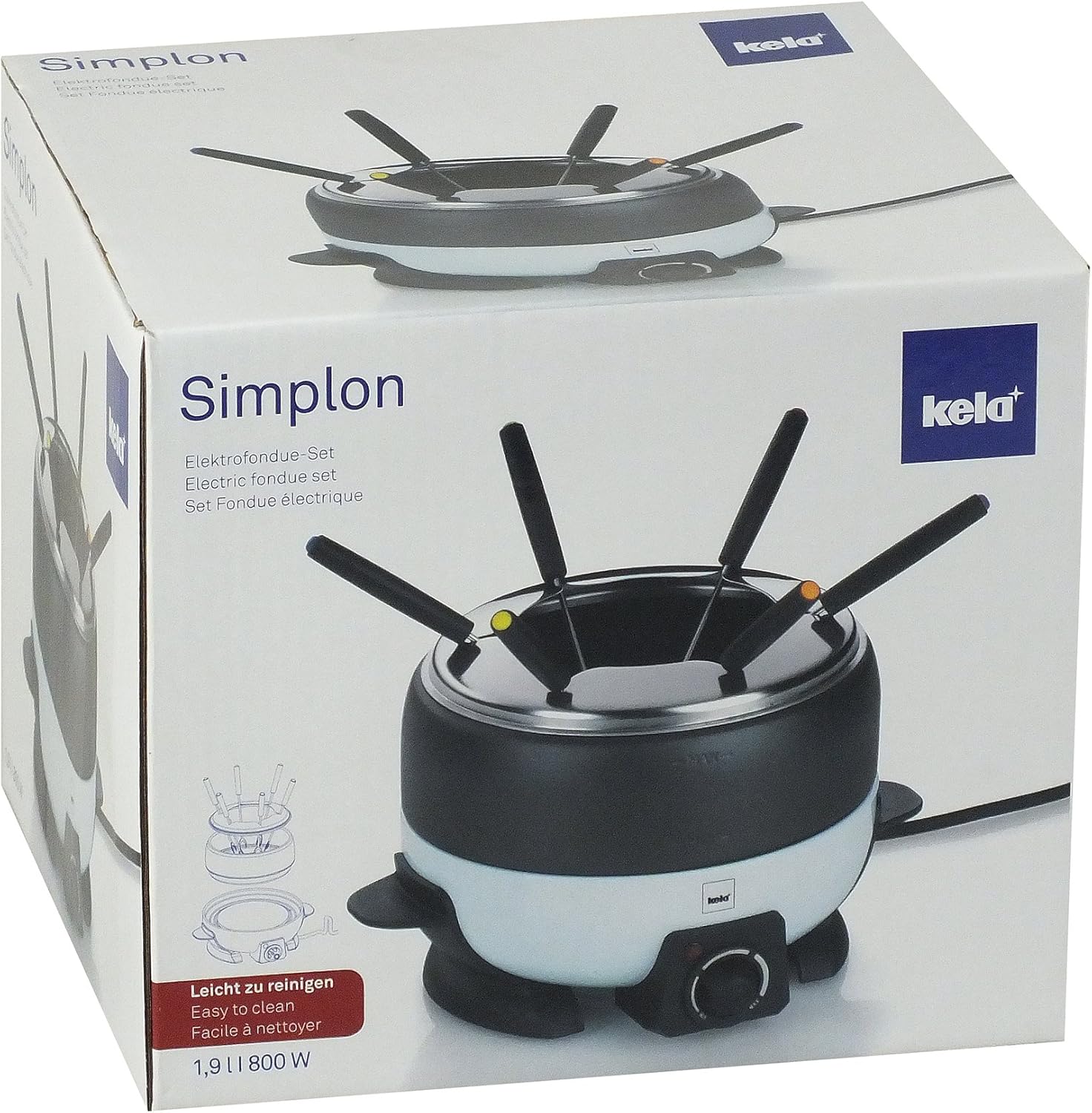 - Lieferumfang: 1 x Kela Elektro-Fondue, Simplon, 66665, 1,9 L, Höhe aufgestellt: ca. 16,5 cm, Ø 20 cm, Inkl. 1 Fonduetopf, 1 Gestell mit Heizplatte, 1 Spritzschutzaufsatz,6 Fondue-Gabeln