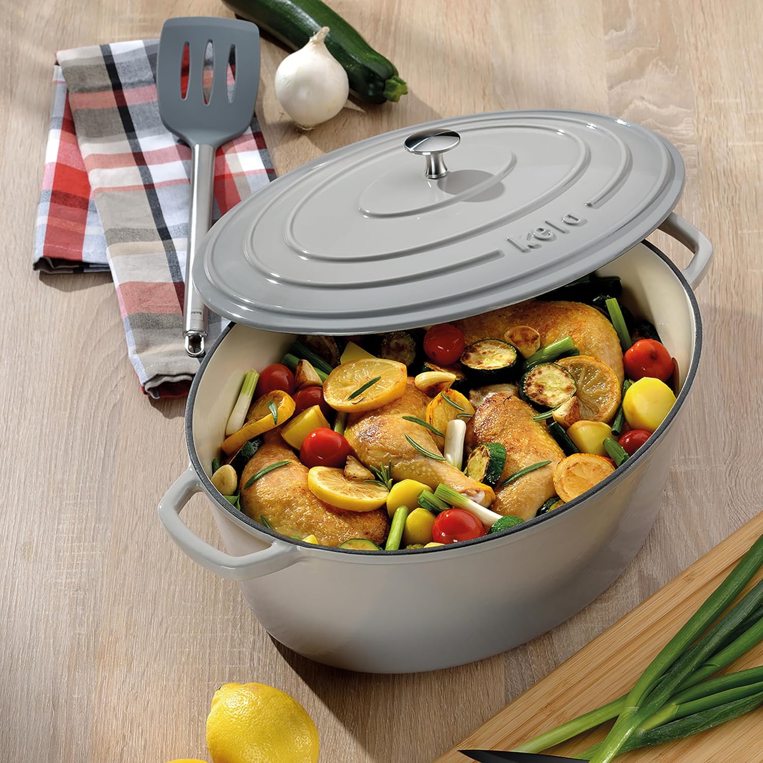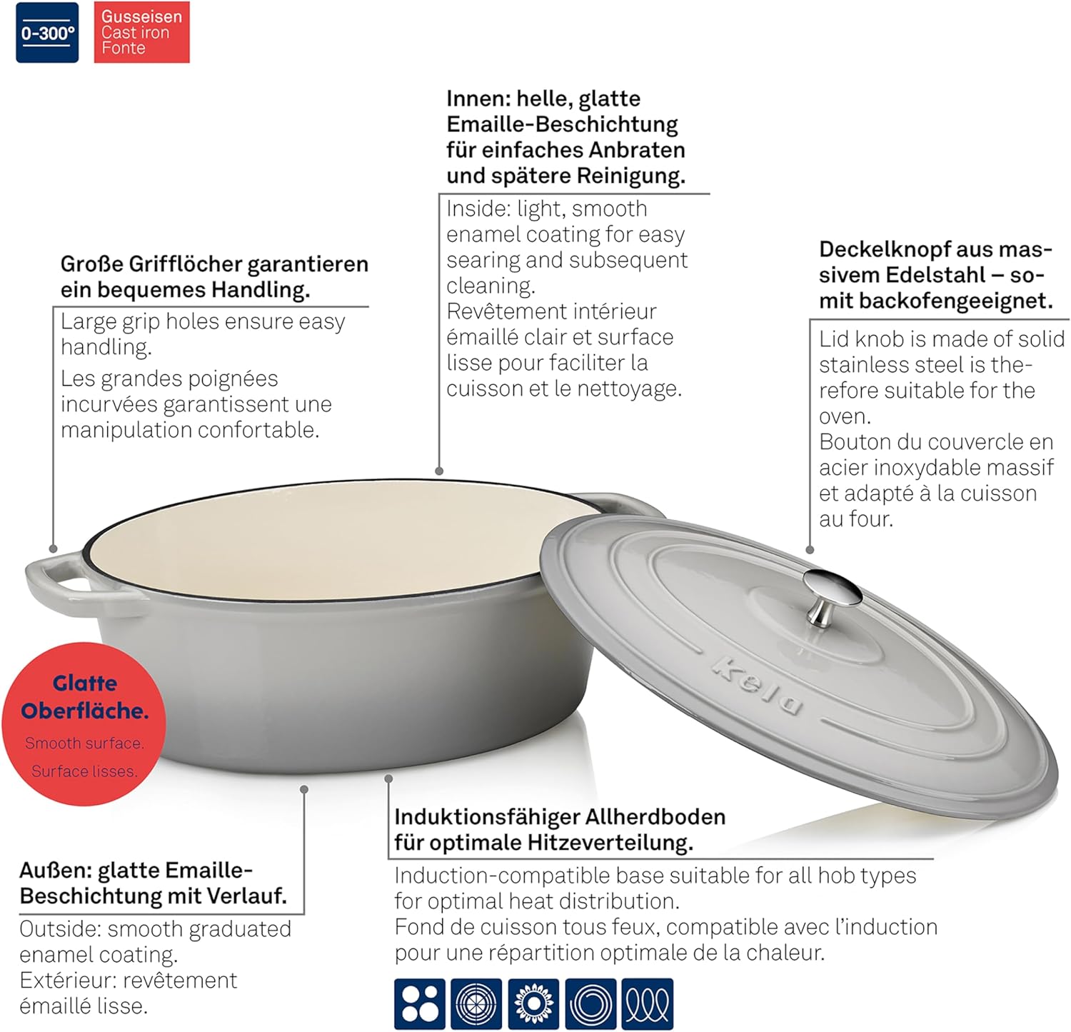 - Lieferumfang: 1x Gusseisen Bräter oval CALIDO hellgrau, Masse 36 x 29 x 15 cm, 9,3 Liter, Bodenmasse 28,5 x 20 cm (Art. Nr. 12609), Material: Gusseisen emailliert, backofenfest bis 300 °C
