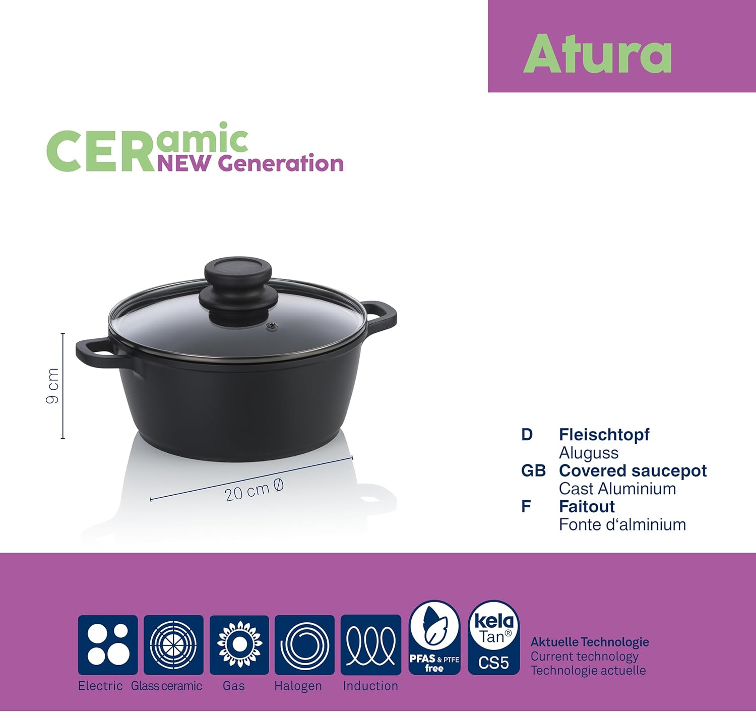 • Lieferumfang: 1x Kochtopf mit Deckel 20 cm (Höhe 9 cm, Volumen 1,7 Liter) ATURA (Art. Nr. 15170), Material: Aluguss keramisch beschichtet, hitzebeständiges Glas. Hitzebeständig bis 230°C (Deckel bis 180°C)