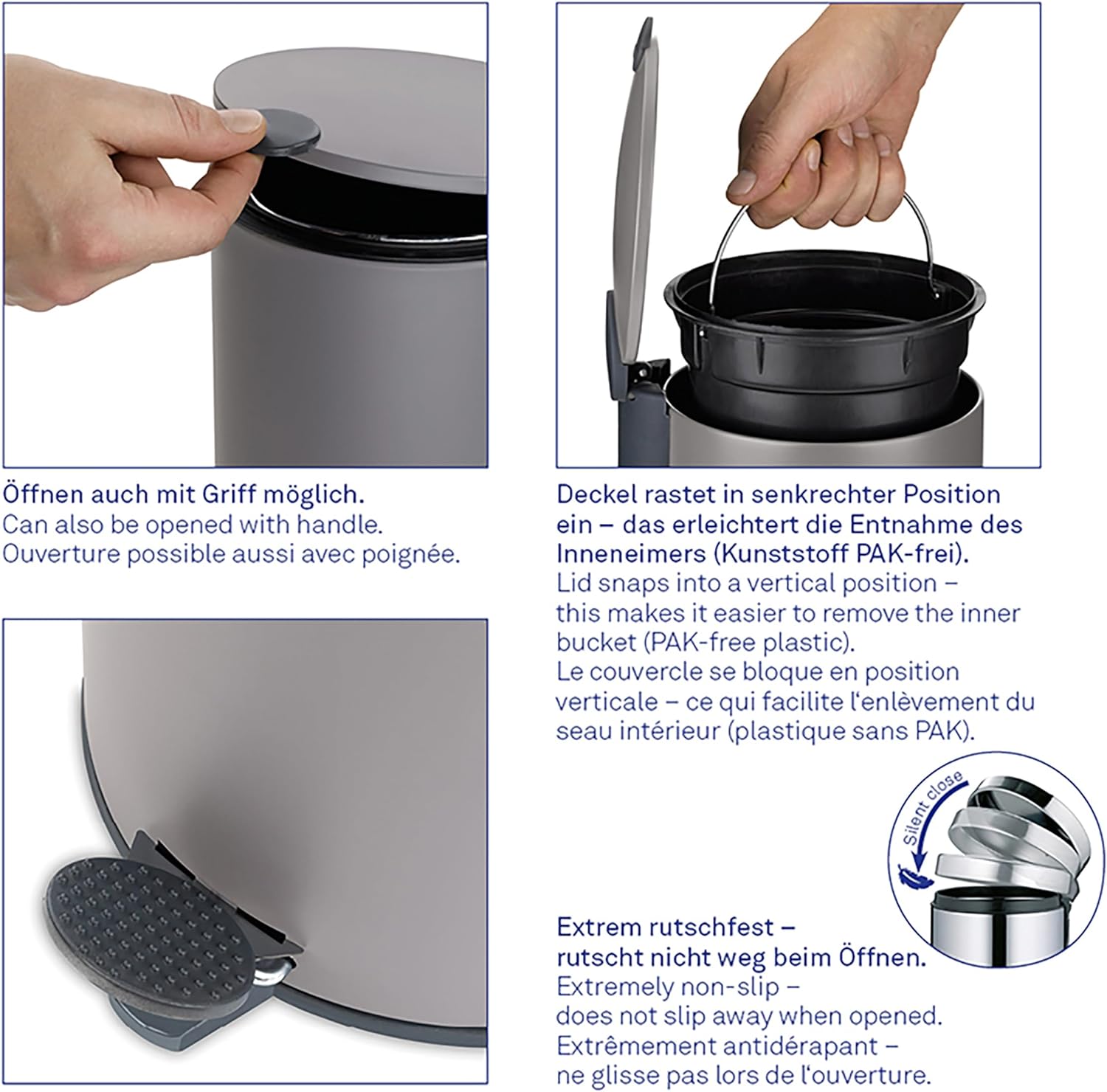 - Sanftes Schliessen des Deckels durch Silent-Close System, Optimale Bedienung durch rutschfreies Pedal, Einfacher Transport durch Metallbügel auf Rückseite, Hohe Standfestigkeit durch Gummierung an Unterseite und runde Form
