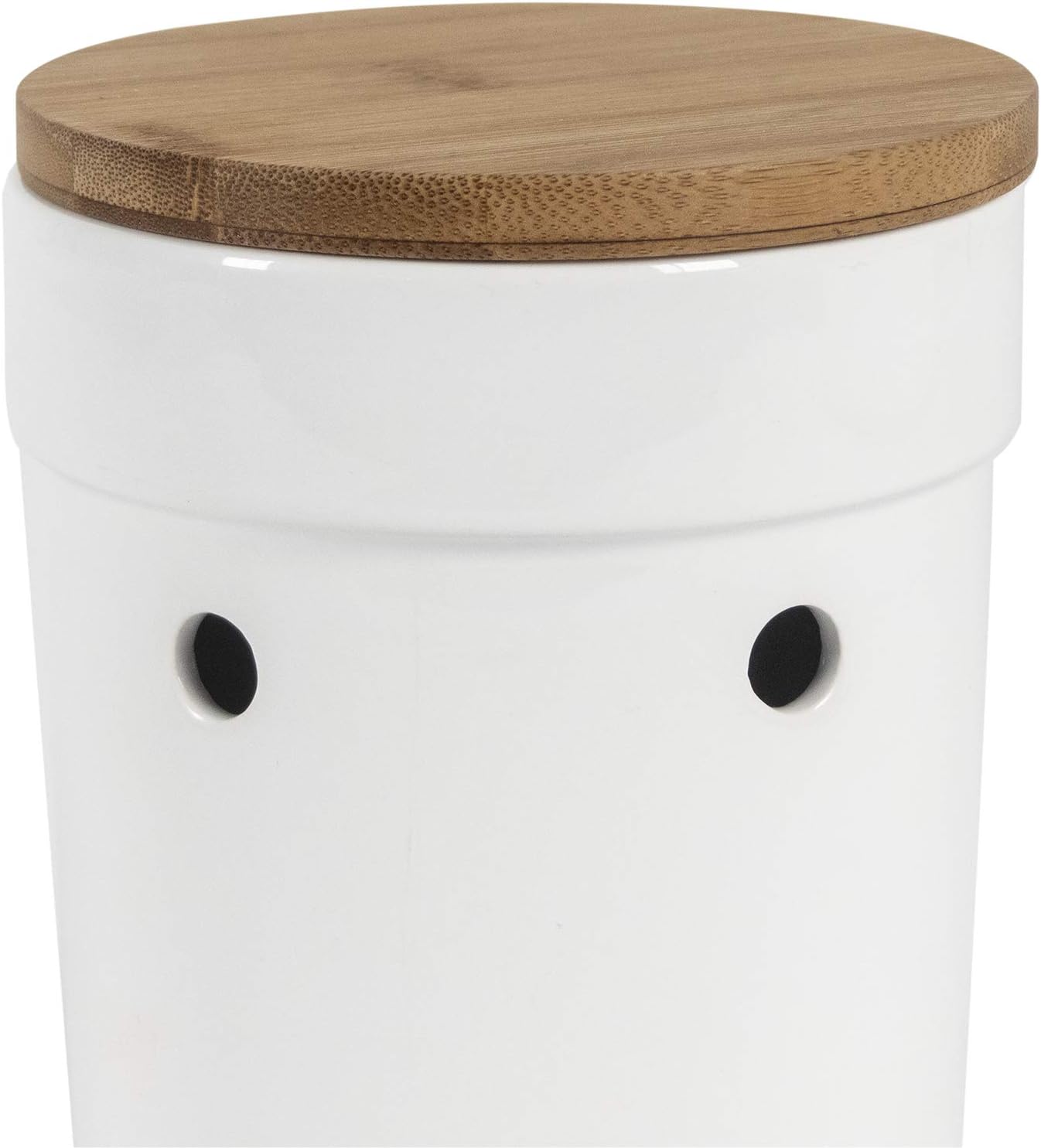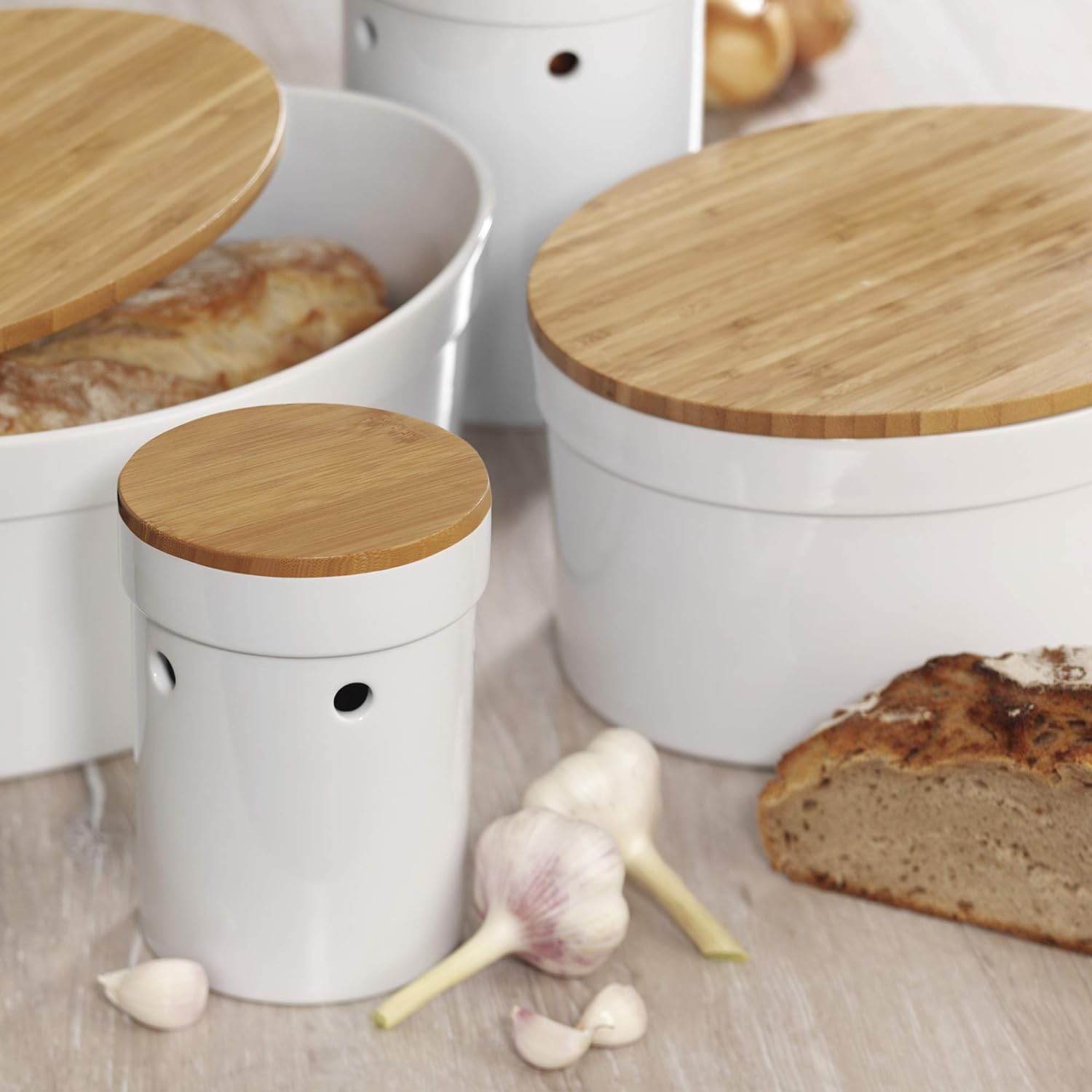 - Lieferumfang: 1 Kela Zwiebeltopf, Salena, 12067, Material: Keramik/Bambus, Mass H: 21 cm, Mass Ø: 13,5 cm, Farbe: Weiss/Holz