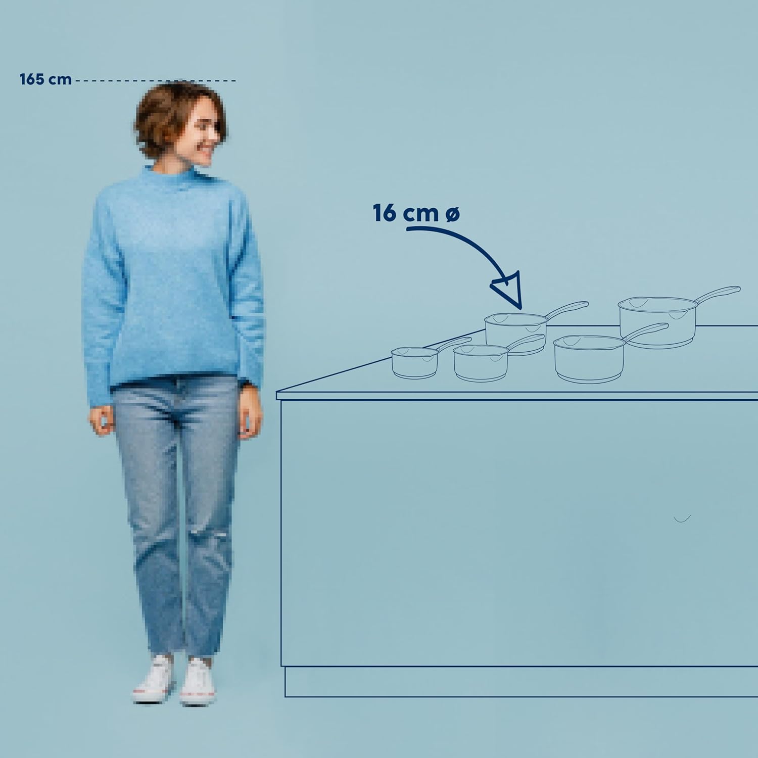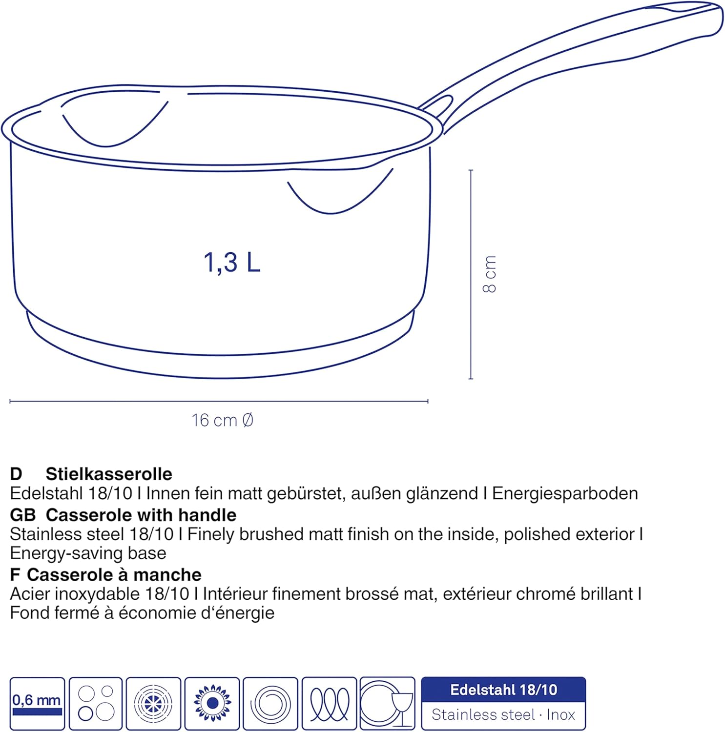 - Lieferumfang: 1x Stielkasserolle 16cm (Höhe 8 cm, 1,3 L, Boden ∅ 14,5 cm) FLAVORIA (Art. Nr. 10181), Material: Edelstahl 18/10, backofenfest bis 220°C. Spülmaschinengeeignet