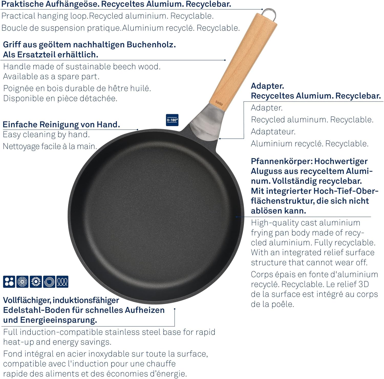 - Langlebige und nachhaltige Pfanne zum scharfen und fettsparenden Anbraten - aus recyceltem und recycelbarem Aluminium
