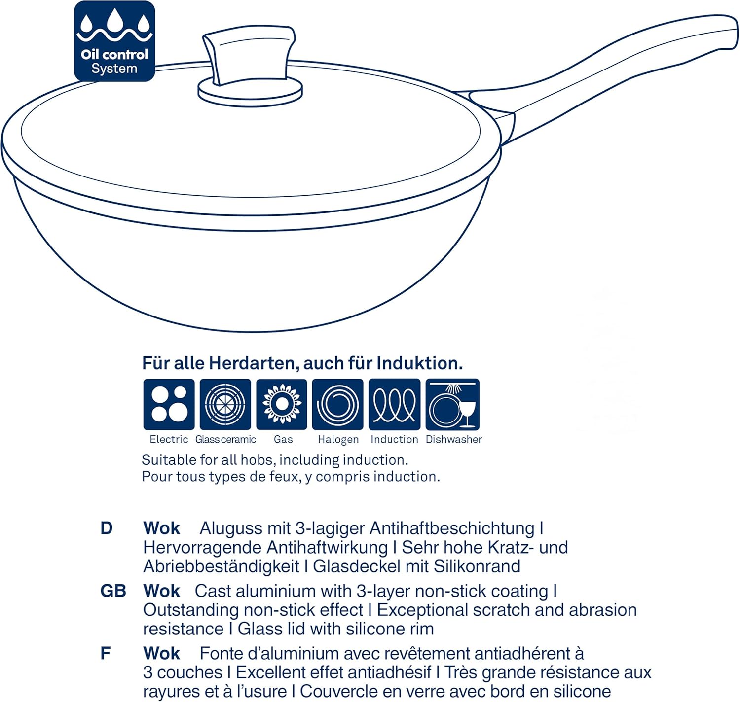 • Wok aus Aluguss mit Glasdeckel geeignet für Gas, Glaskeramik, E- und Induktionsherd, Hitzebeständig bis 180°C, Ergonomische Softtouch-Griffe