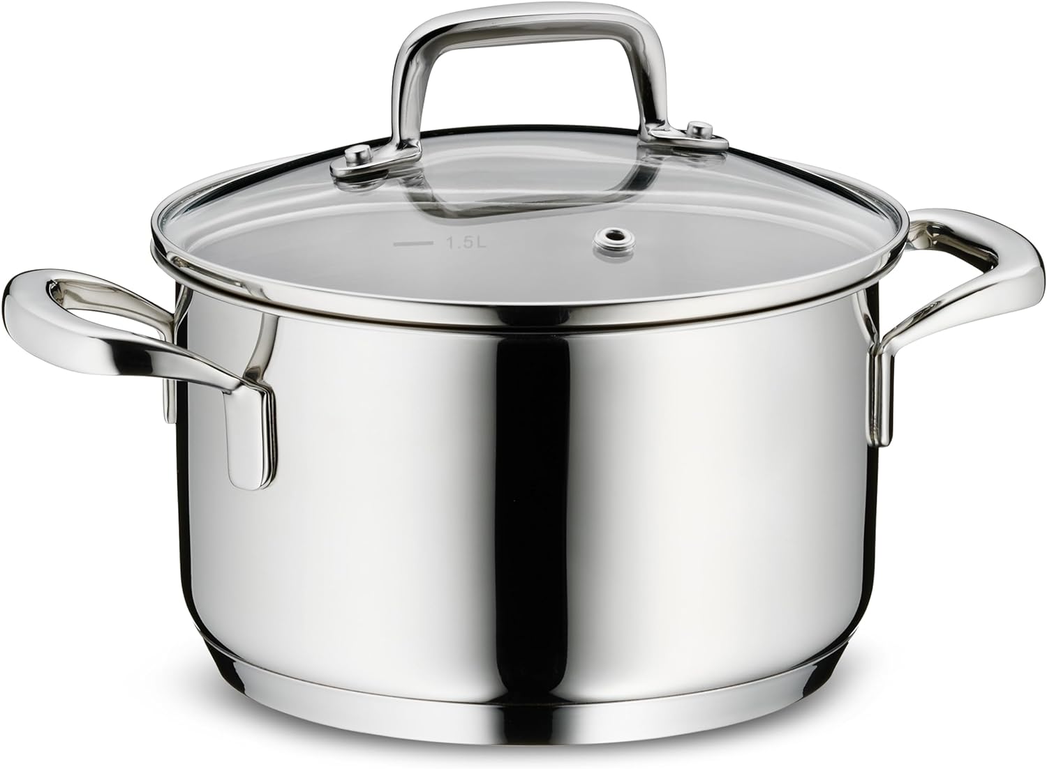 - Angenehme Handhabung dank seitlicher Edelstahlgriffe, Glasdeckel mit Edelstahlgriff, Kleckerfreies Ausgiessen dank Schüttrand, Energiesparend durch Kapselboden zur optimalen Wärmeverteilung