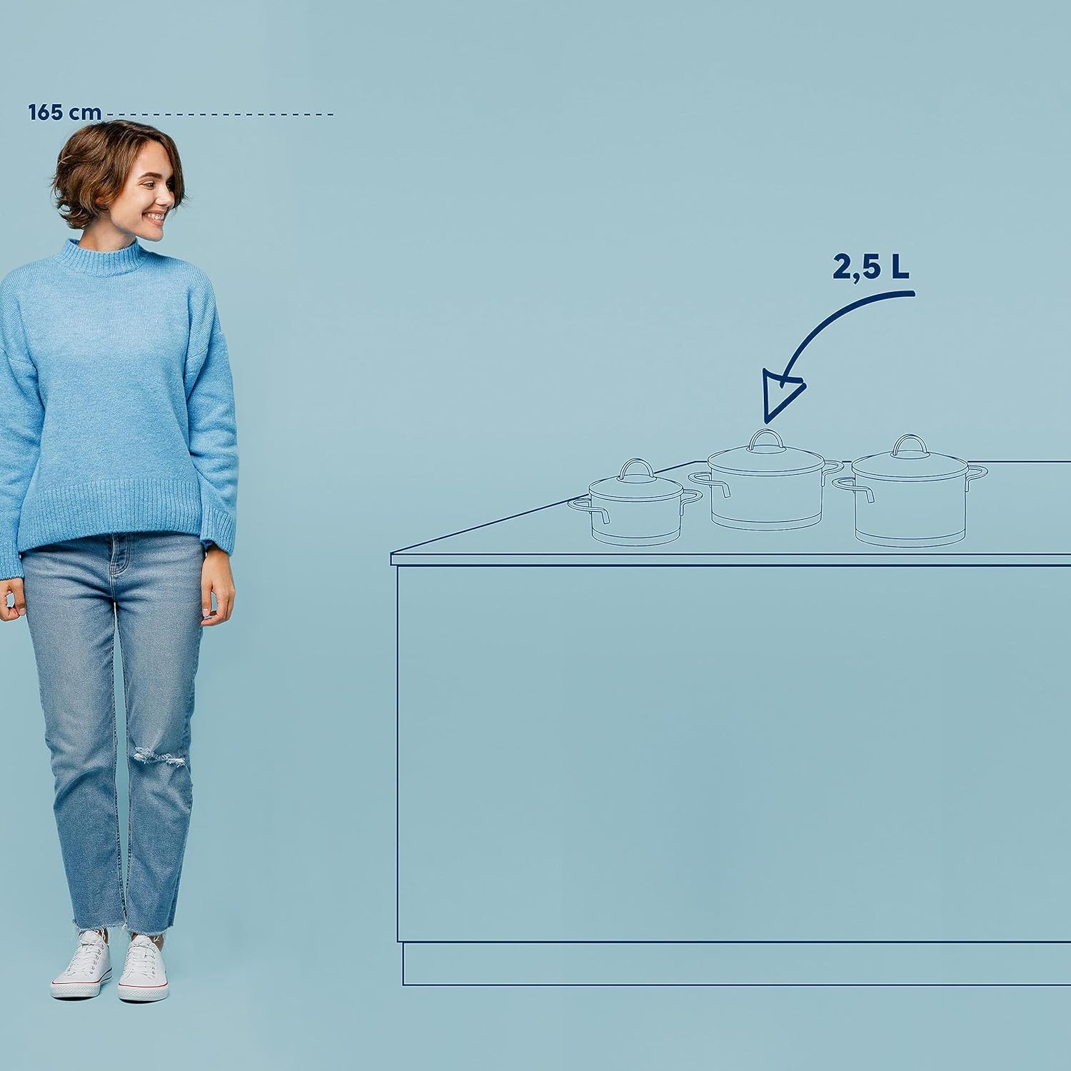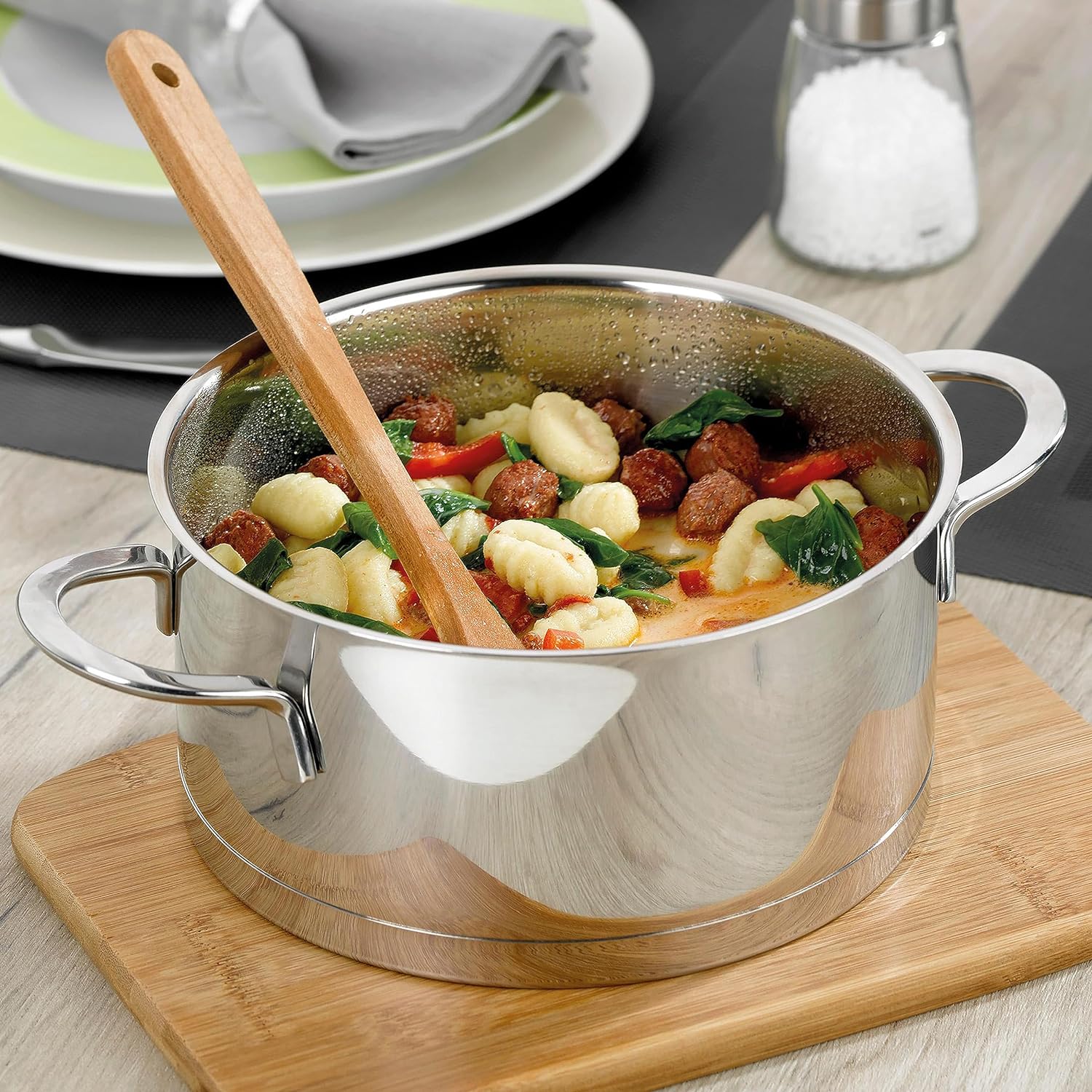 - Angenehme Handhabung dank seitlicher Edelstahlgriffe, Glasdeckel mit Edelstahlgriff, Kleckerfreies Ausgiessen dank Schüttrand, Energiesparend durch Kapselboden zur optimalen Wärmeverteilung und 0,6 mm Wandstärke