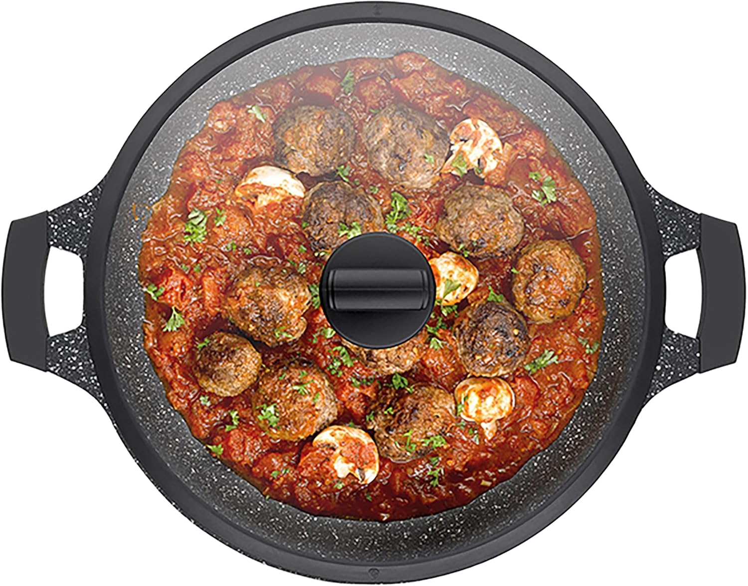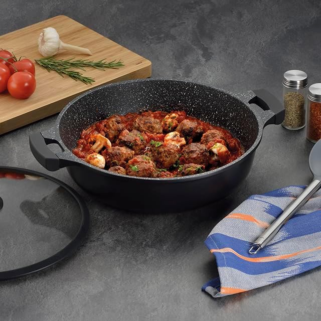 • Spass in der Küche durch einfaches Zubereiten von leckeren Gerichten: Servierpfanne mit Deckel zum Kochen, Überbacken oder Servieren – Geeignet für Gas, Glaskeramik, Halogen, E- und Induktionsherd
