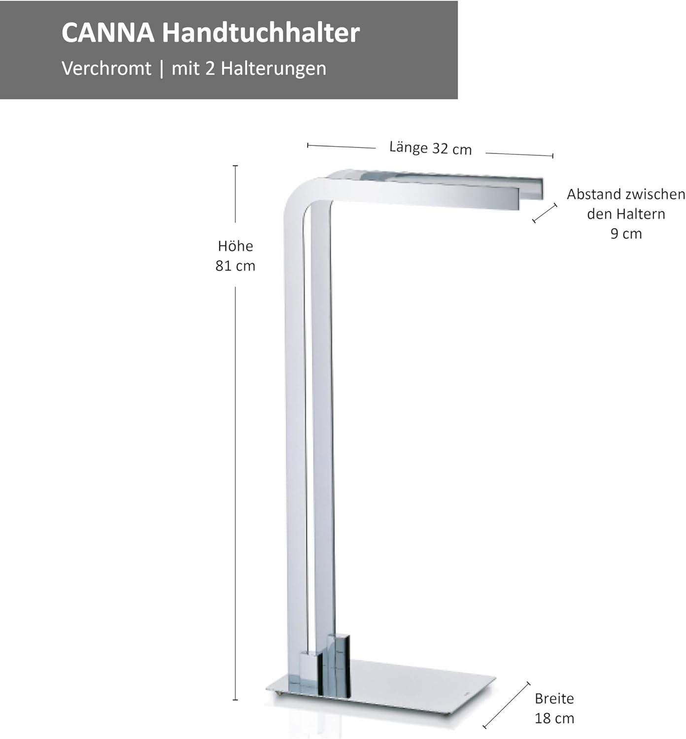 - Lieferumfang: 1 Kela Handtuchhalter Canna 21990, Verchromtes Metall, Länge Handtuchstange: 32 cm, L x B x H: 32 x 18 x 81 cm, Oberfläche verchromt, Inkl. Montageanleitung und Zubehör