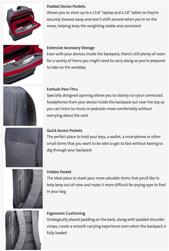 - Padded storage pockets for up to a 15.6" laptop and a 10" tablet