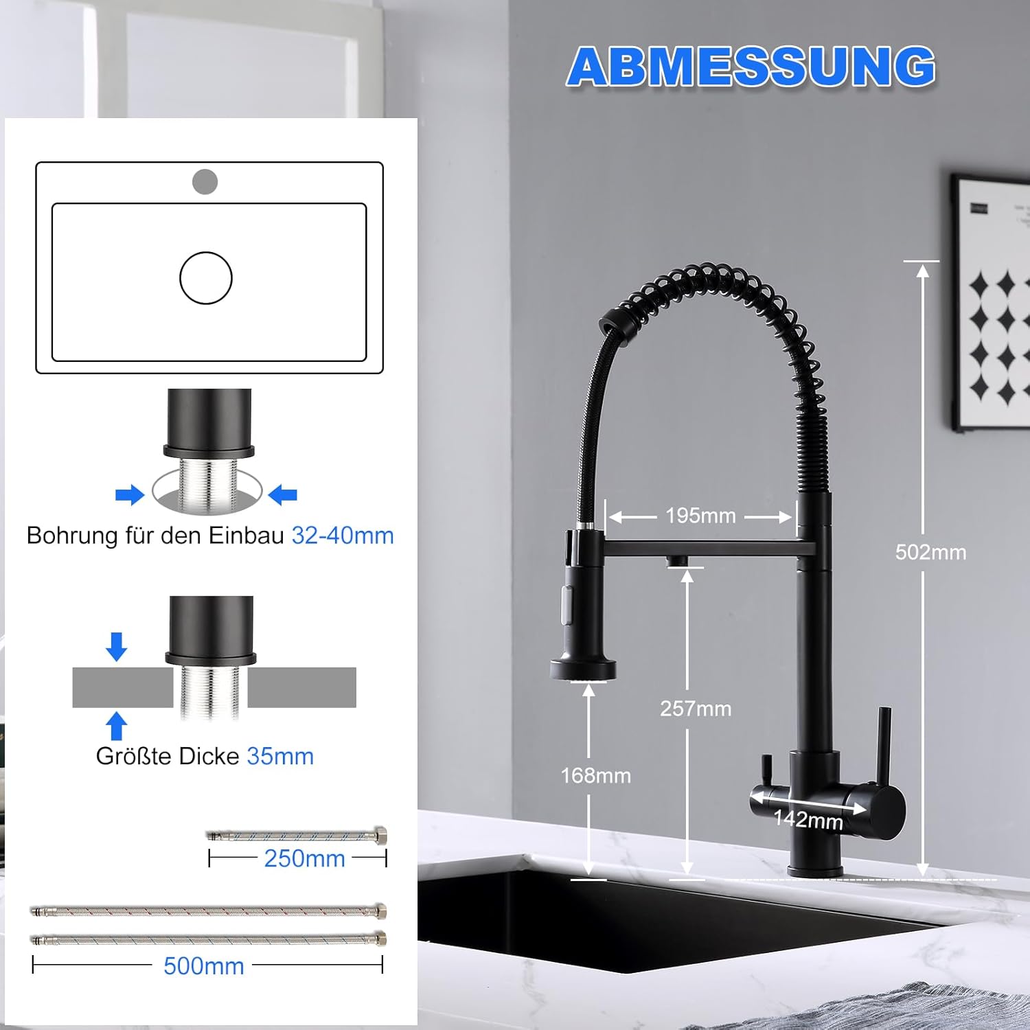 • EINFACHE INSTALLATION: Die Küchenspültischarmatur mit Standard G 3/8 Anschluss kann an alle gängigen Warm- und Kaltwasserdrucksysteme und Trinkwassersysteme mit G1/2, G1/4" oder G3/8" Schlauch angeschlossen werden. Das mitgelieferte Montageset und die