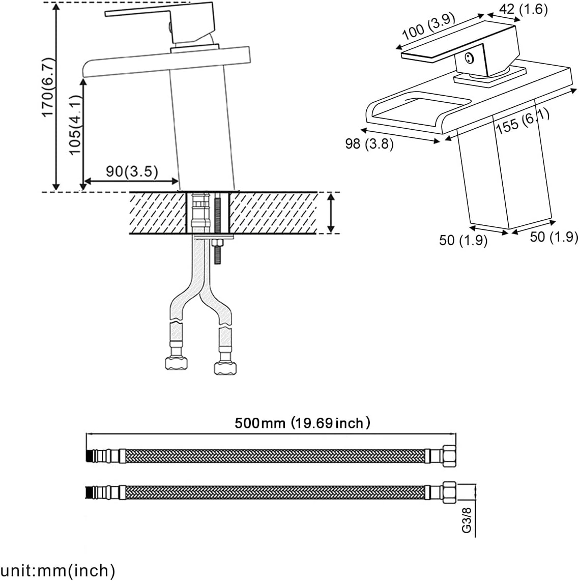 - 【MASSNAHMEN】 Gesamthöhe: 170mm(6.7") / Auslauflänge: 155mm(6.1") / Auslaufhöhe: 105mm(4.1")/Schlauchlänge 500mm(19.69")/Lochdurchmesser:32-40mm