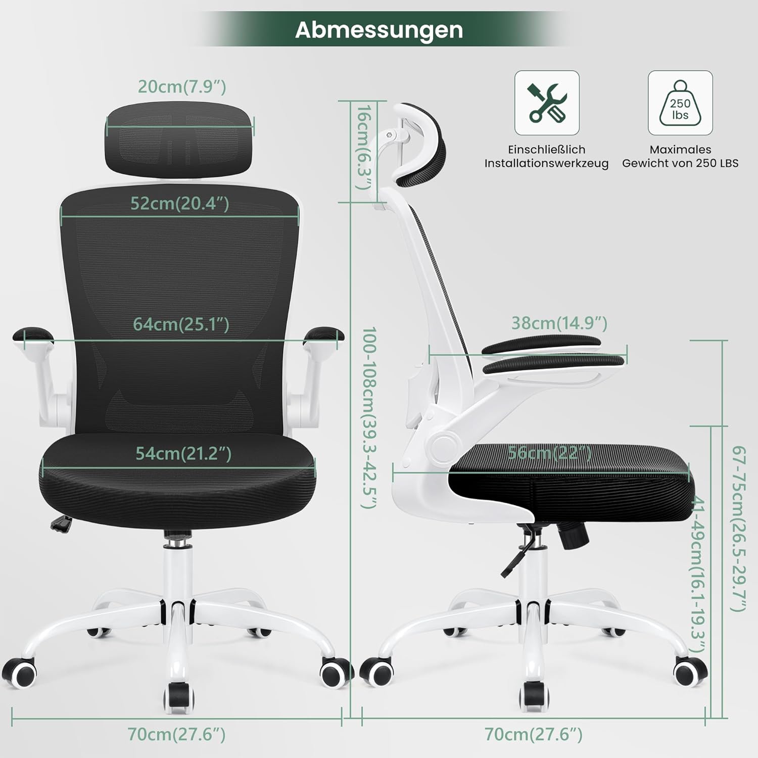 - 【Komfortabler Ergonomisch Bürostuhl】Die ergonomische Bürostuhle besteht aus hochelastischen Stoff, der Ihnen eine bequeme und atmungsaktive Sitzposition bietet. Ausgestattet mit um 15° hochklappbaren Armlehnen, einer um 7 cm verstellbaren