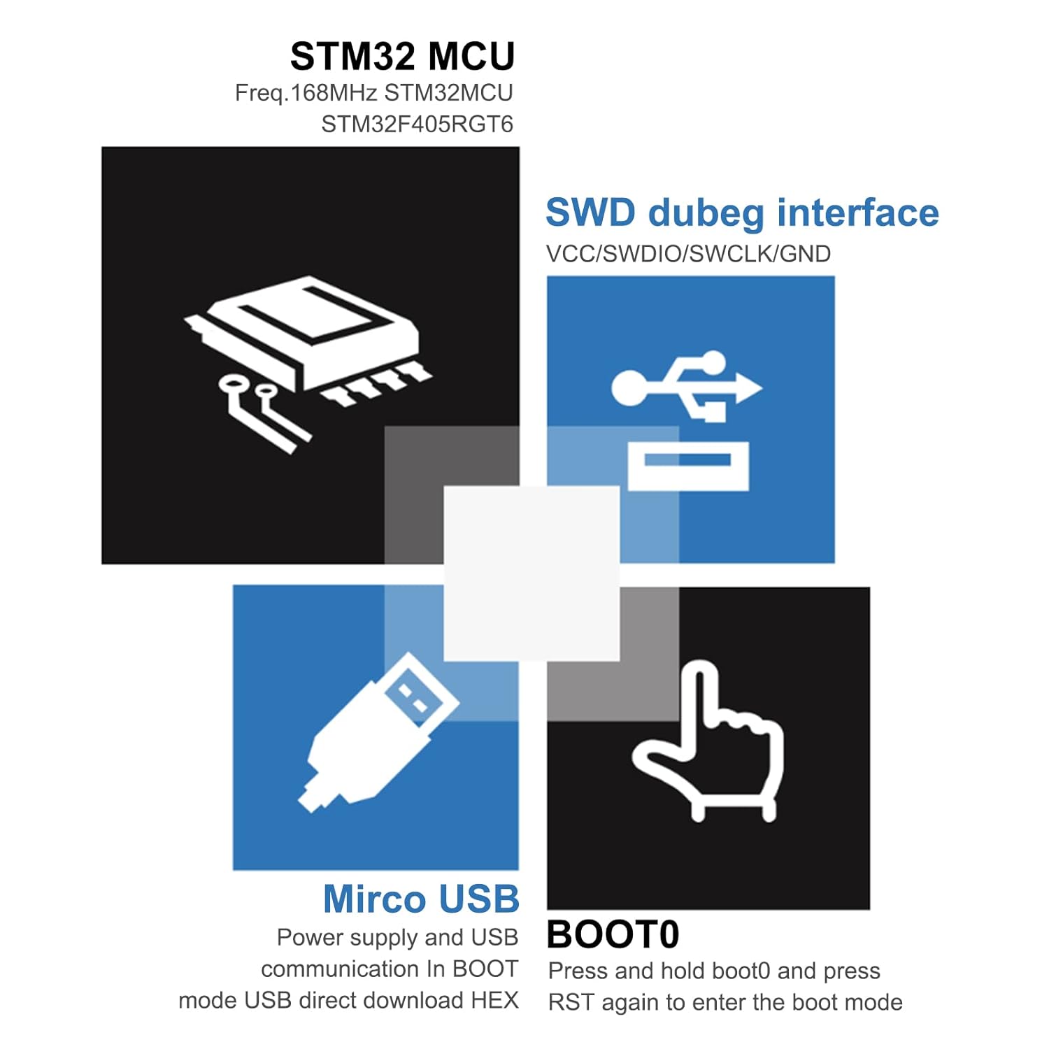 - Die 4 LEDs auf dem For Pyboard, die USR-Taste, die Reset-Taste und die Booto-Taste, können das System anzeigen und verwenden, um mit ihm zu interagieren