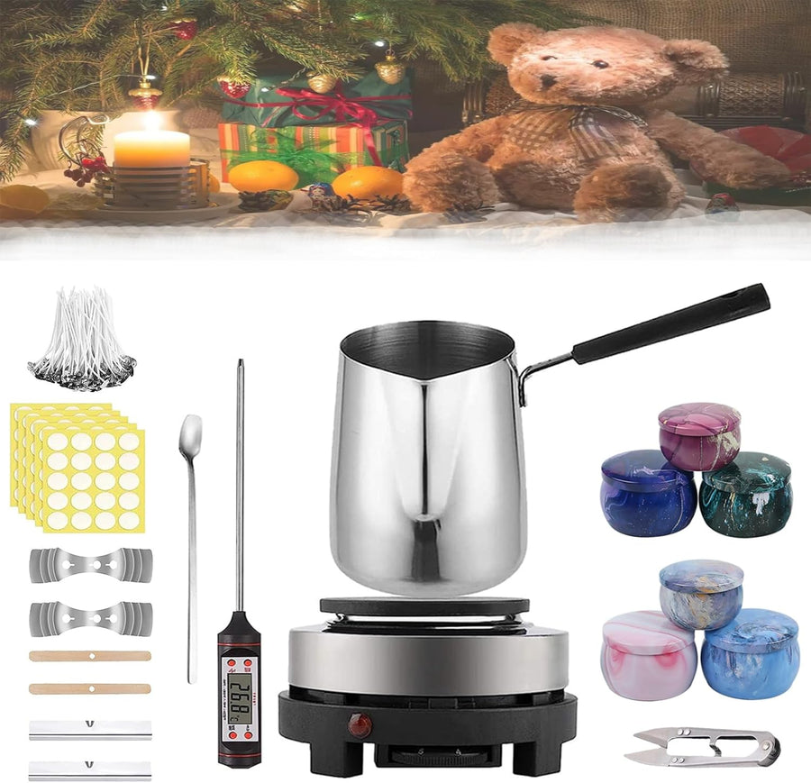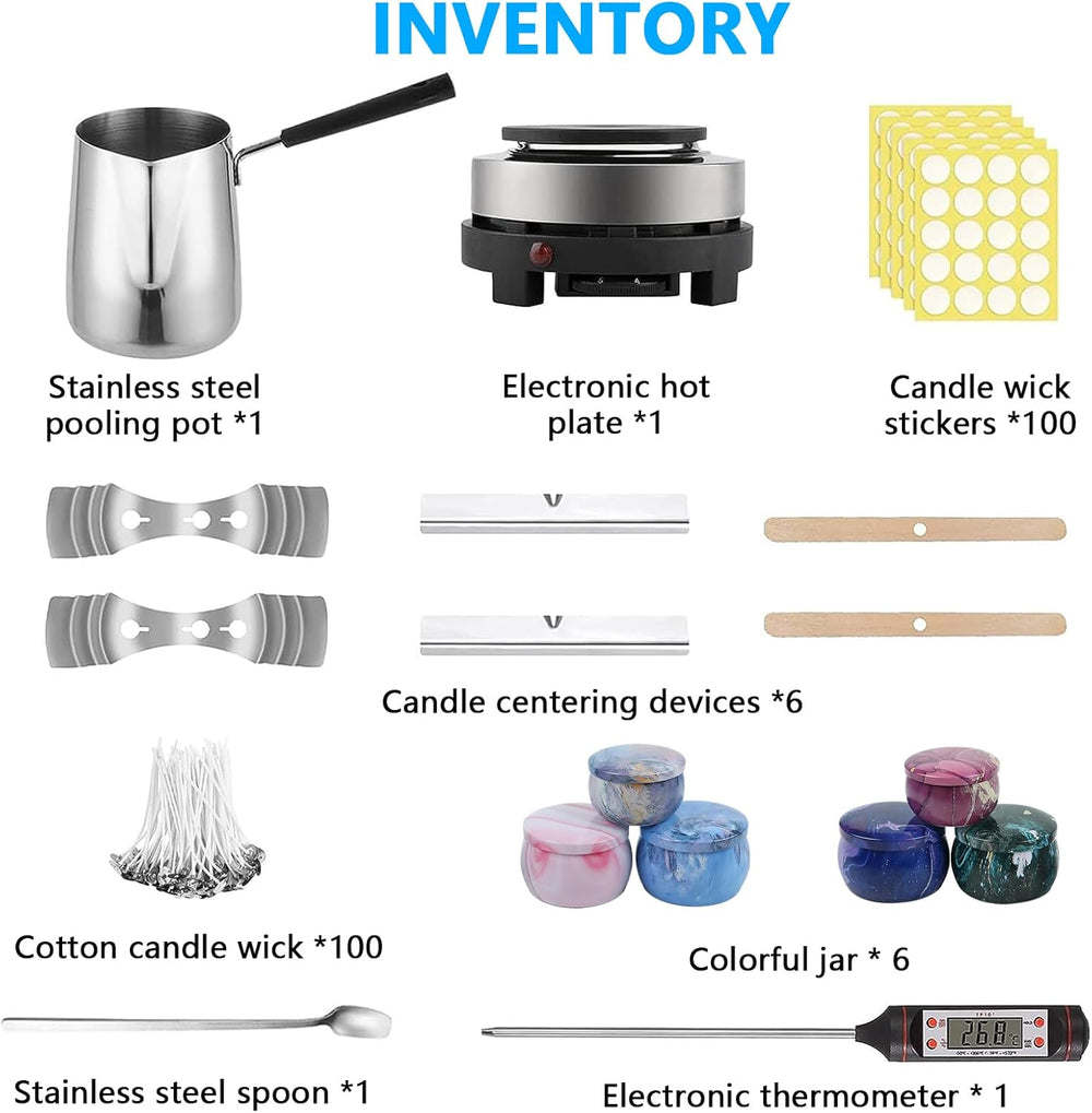 - đăKit zur Kerzenherstellungă Das Kit enthĂ€lt einen elektronischen Heizofen, einen 600 ml Edelstahl-Ausgiesser, ein Thermometer, 100 8cm Baumwoll-Kerzendochte, 100 Kerzenpositionierungsaufkleber, 6 Kerzenzentriervorrichtungen,1 Edelstahllöffel,6