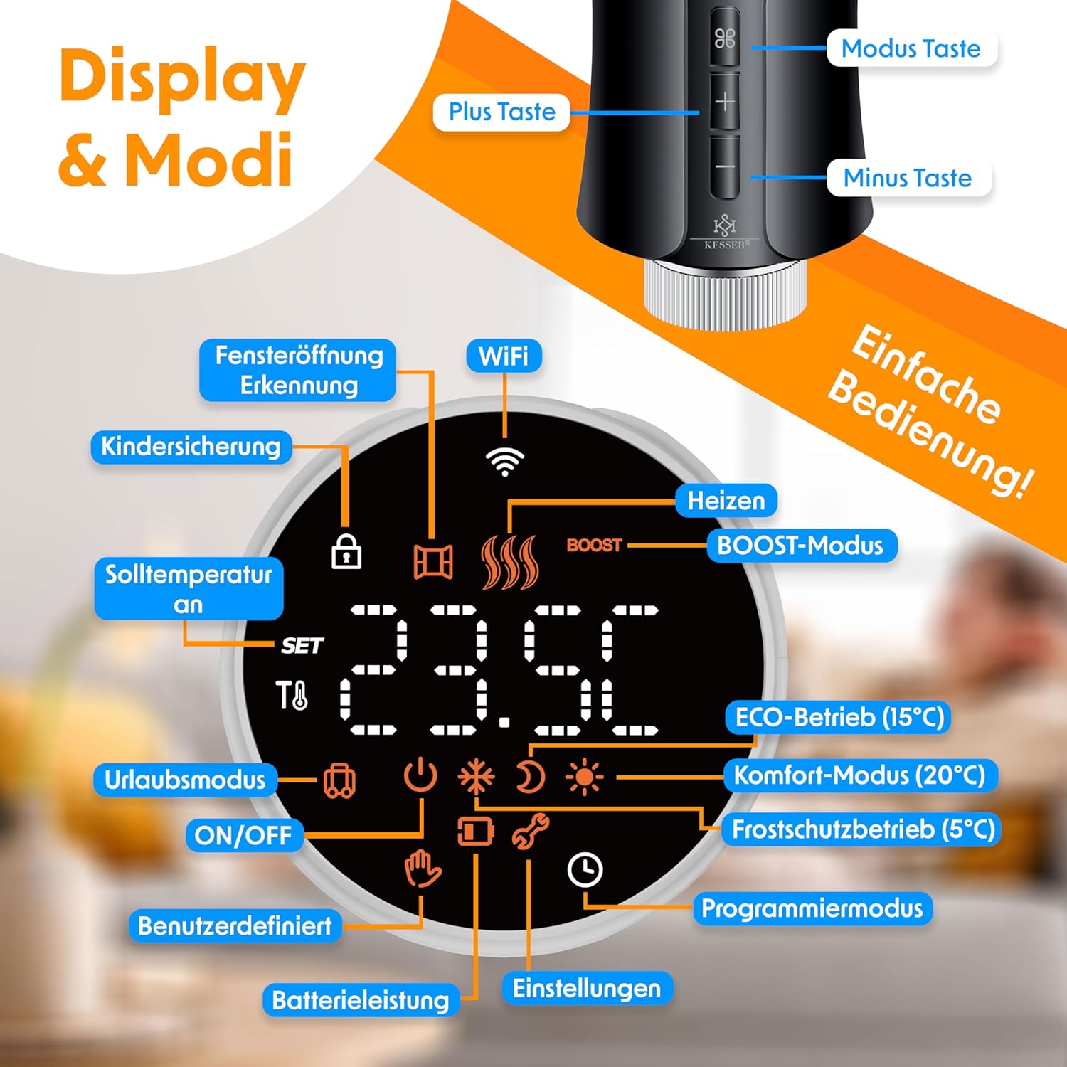 - 📱𝐈𝐍𝐓𝐄𝐋𝐋𝐈𝐆𝐄𝐍𝐓𝐄 𝐀𝐏𝐏-𝐒𝐓𝐄𝐔𝐄𝐑𝐔𝐍𝐆: Steuern Sie Ihr KESSER Heizungsthermostat bequem von Smartphone, PC oder Notebook – zuhause oder unterwegs. Passen Sie die Temperatur präzise in