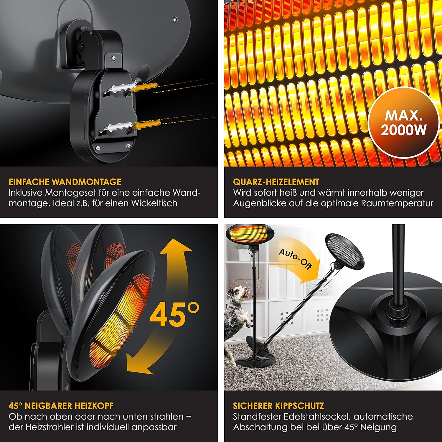 - Schutzklasse IPX4: spritzwassergeschützt : kann bis zu 45° geneigt werden. Für Innen und Aussen geeignet. Durch die rückseitige Montageplatte auch zur Wandmontage geeignet. Das Heizgerät erzeugt die optimale Strahlungswärme. Eine Erwärmung und Umwälzung der Luft entfällt zum grössten Teil. Es entsteht ein angenehmes und vor allem gesundes Raumklima mit einer optimalen Luftfeuchtigkeit. Wärme wie von der Sonne.leistungstarker Infrarot Terrassenheizer 2000 Watt mit 3 Quarzheizelementen.