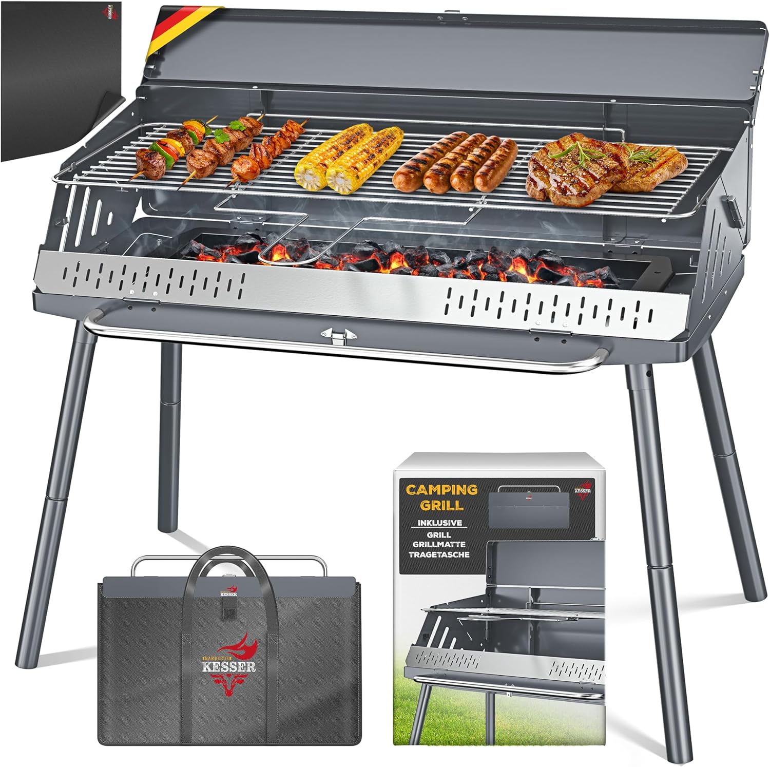 • ๐™๐–๐„๐ˆ ๐•๐€๐‘๐ˆ๐€๐๐“๐„๐ ๐…รœ๐‘ ๐Œ๐€๐—๐ˆ๐Œ๐€๐‹๐„ ๐…๐‹๐„๐—๐ˆ๐๐ˆ๐‹๐ˆ๐“ร„๐“: Wรคhle dein KESSER Camping Grill-Set wahlweise mit klappbarem Gestell (82cm Arbeitshรถhe) oder als kompakte