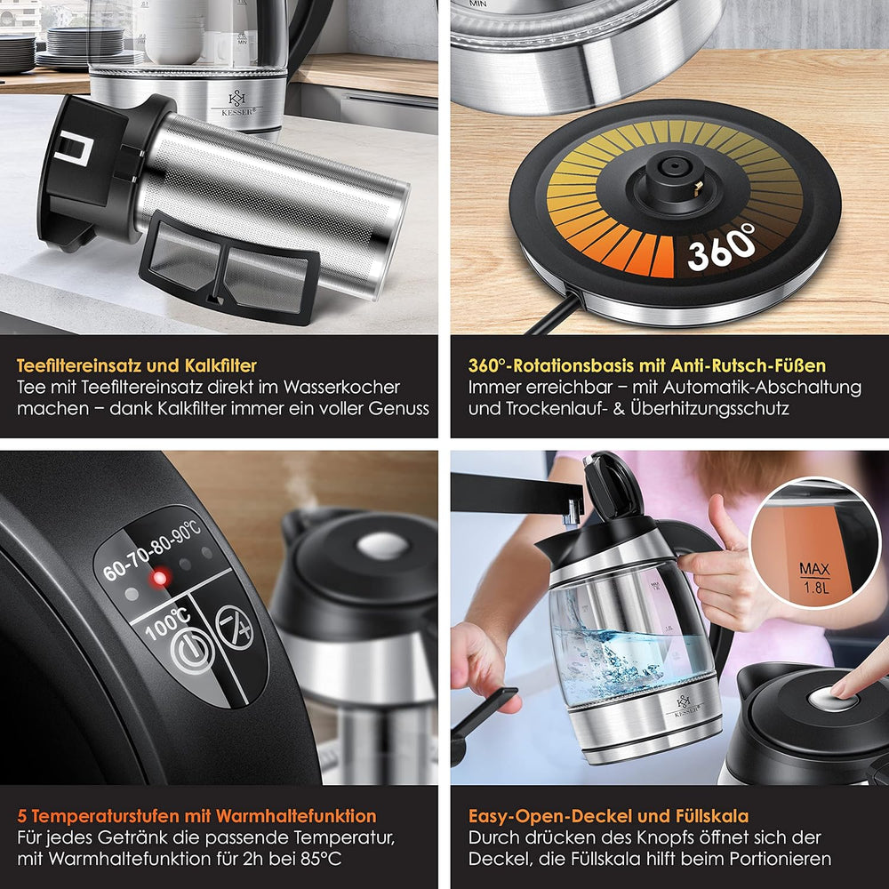 - 2200 Watt Edelstahl Glaswasserkocher mit 1,8 Liter Fassungsvermögen