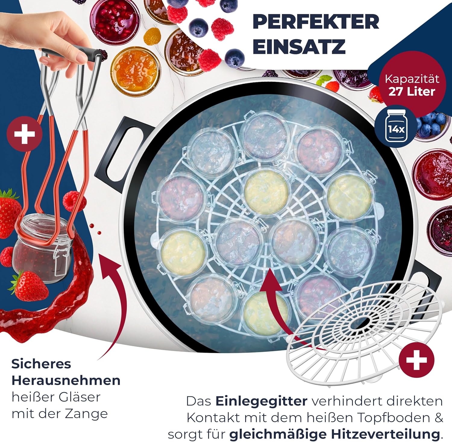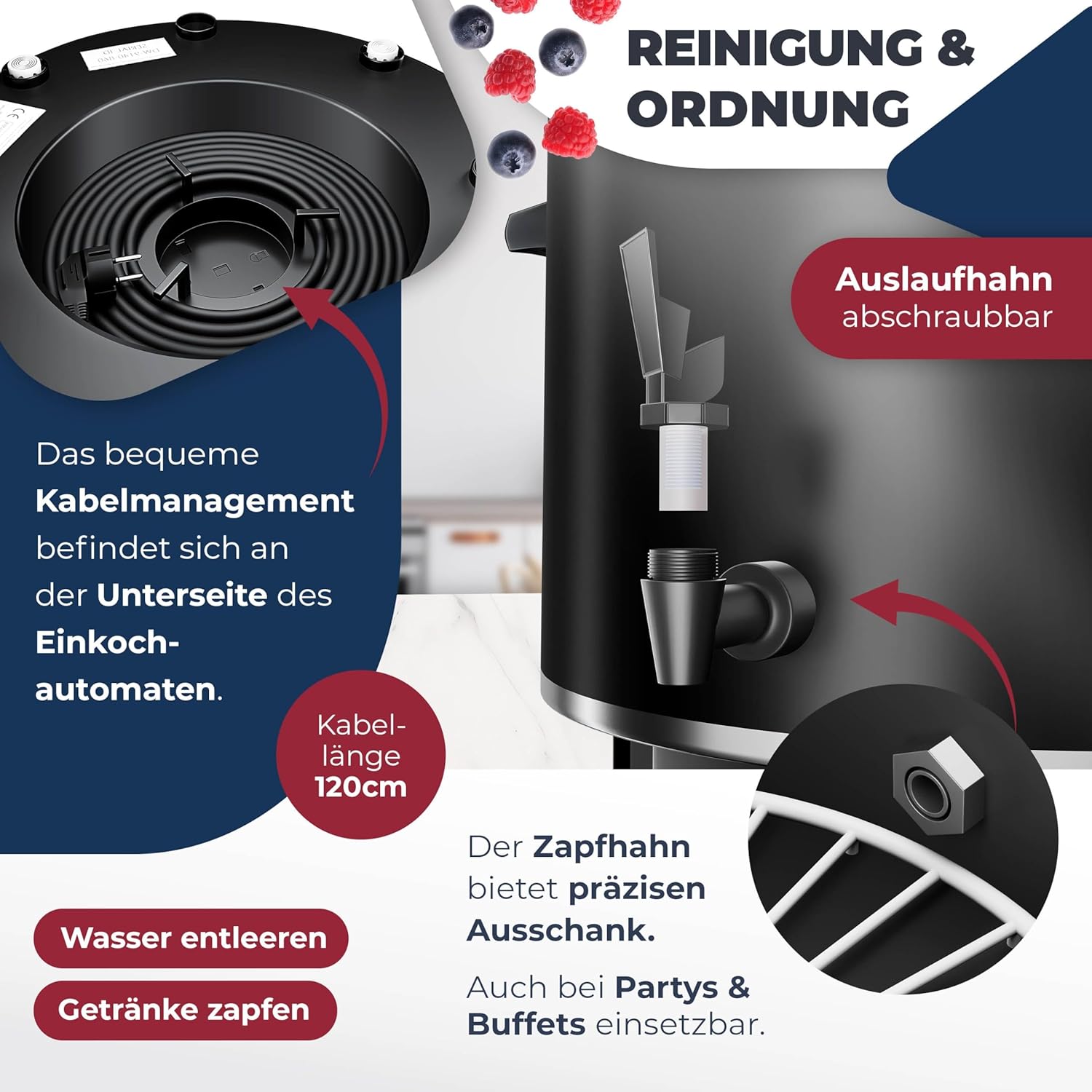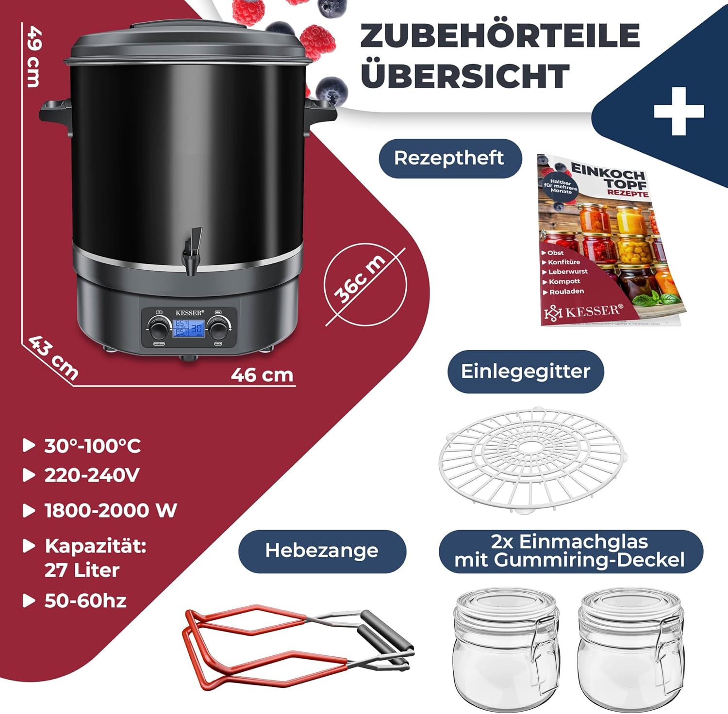- 𝐋𝐄𝐈𝐒𝐓𝐔𝐍𝐆: 2000 W starker Einkochvollautomat mit 27 Liter Fassungsvermögen zum Einwecken von bis zu 14 Litergläsern auf einmal.