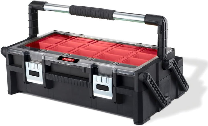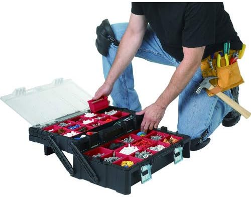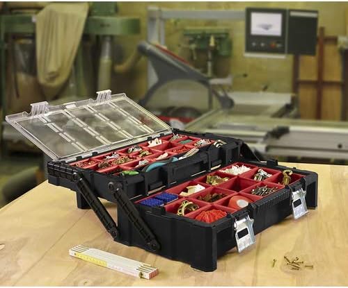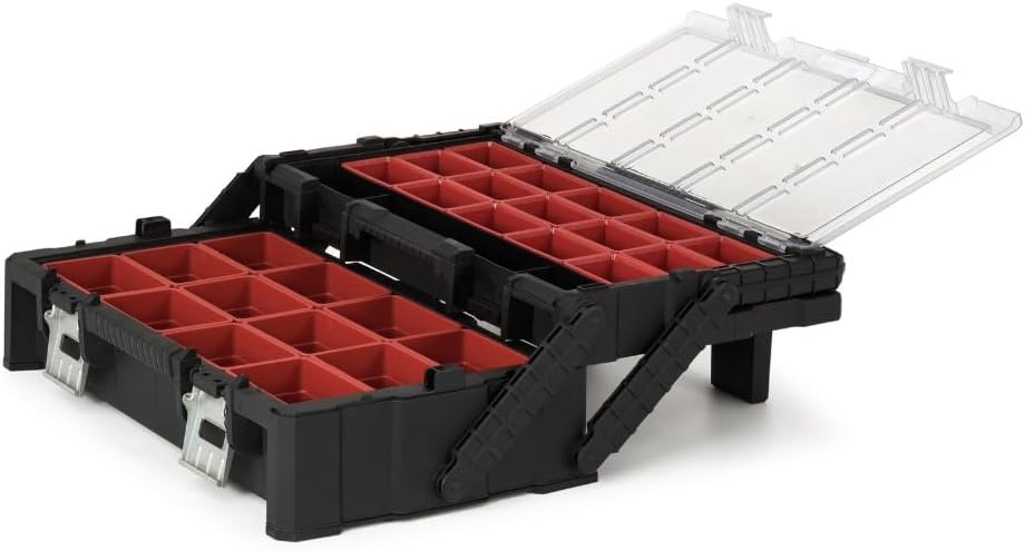 - stabiler Sortimentskasten mit 2 Ebenen, Metallgriff und Metallverschlüssen