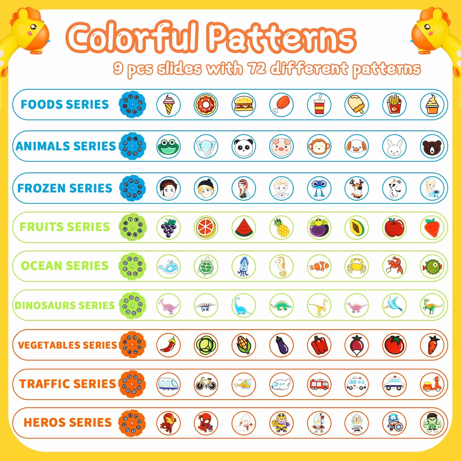 - 【Weitere Bild Discs】 Trace and Draw Projector Toy wird mit 9 Dias (Früchte, Gemüse, Lebensmittel, Tiere, Helden, Gefrorenes, Dinosaurier, Ozean, Verkehr) und 72 verschiedenen Mustern geliefert. Kinder können nach Belieben wechseln und in sie