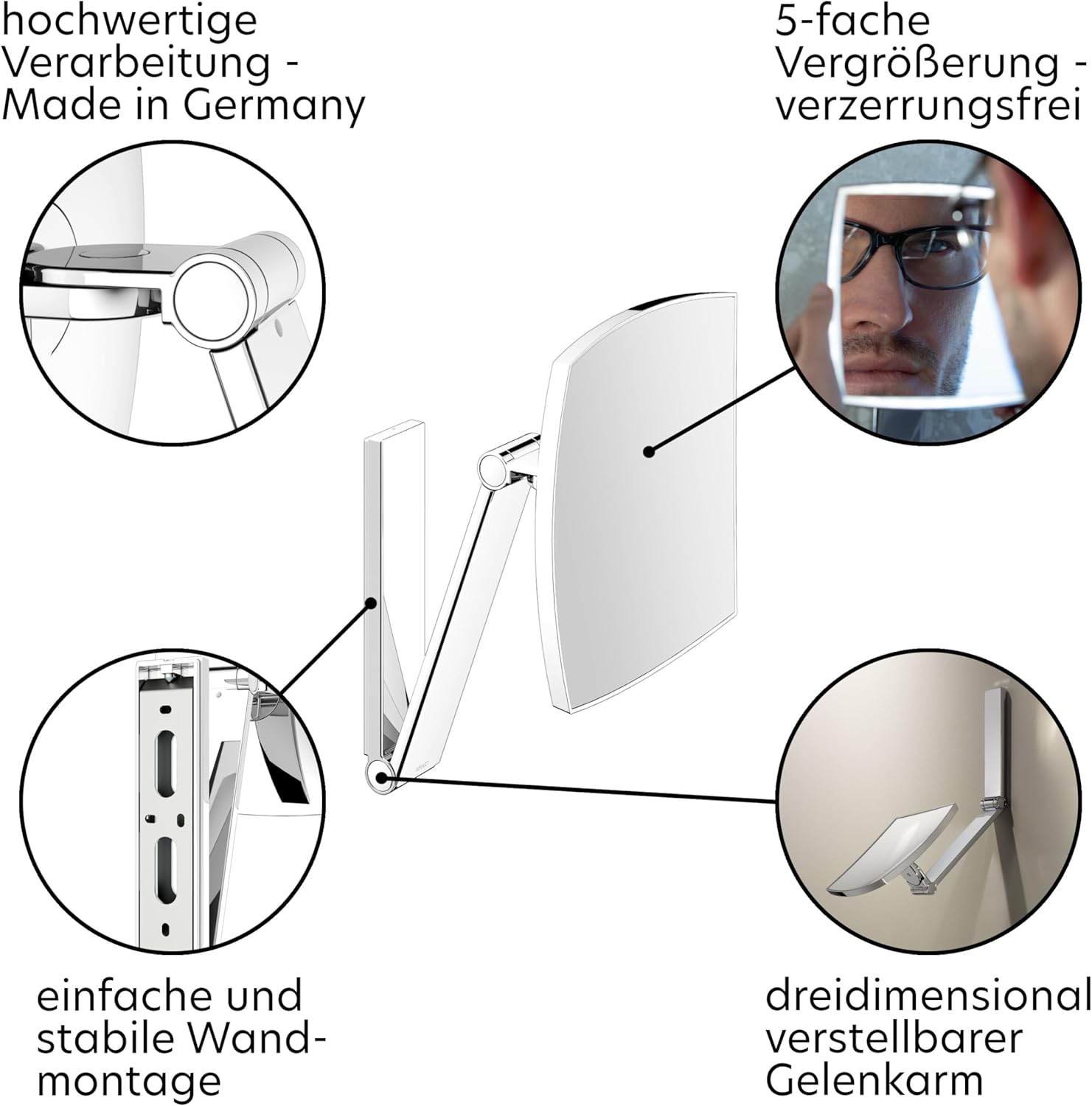 - Flexibler Blickwinkel: Durch den dreidimensional verstellbaren Schwenk-Arm und die 5-fache Vergrösserung eignet sich der Spiegel optimal für die tägliche Pflege, z.B. beim Schminken oder Rasieren