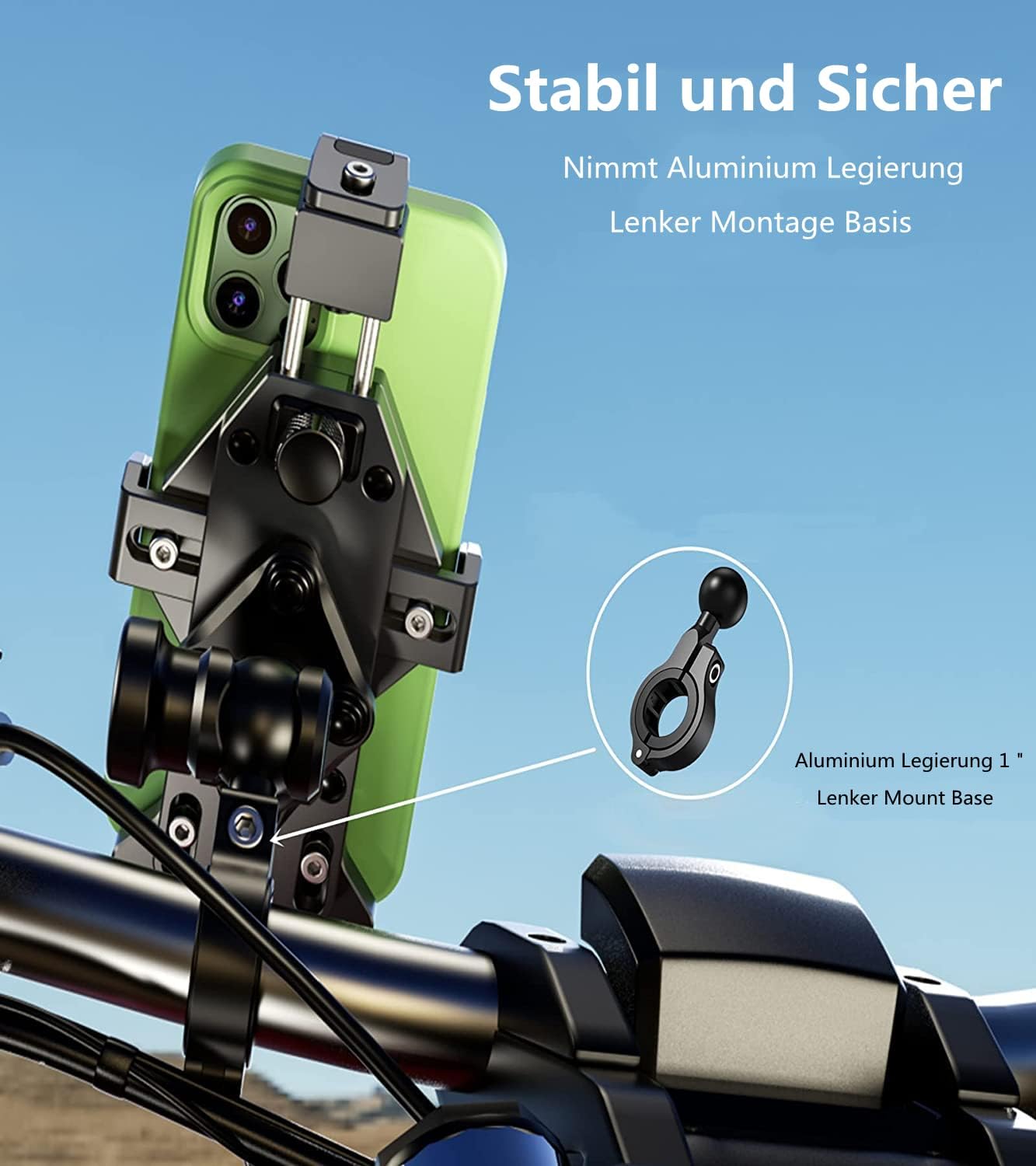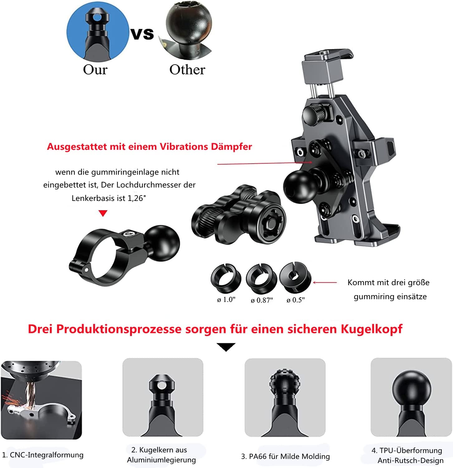• 【Robust und Sichern】 Gemacht aus 6061-T6 Aluminiumle gierung. Motorrad Handyhalterung ist mit einem Vibrationsdämpfer und einem Anti-Diebstahl doppelsteckarm ausgestattet. Ausgestattet mit einer Lenkerhalterung aus Aluminiumle gierung. Dieser