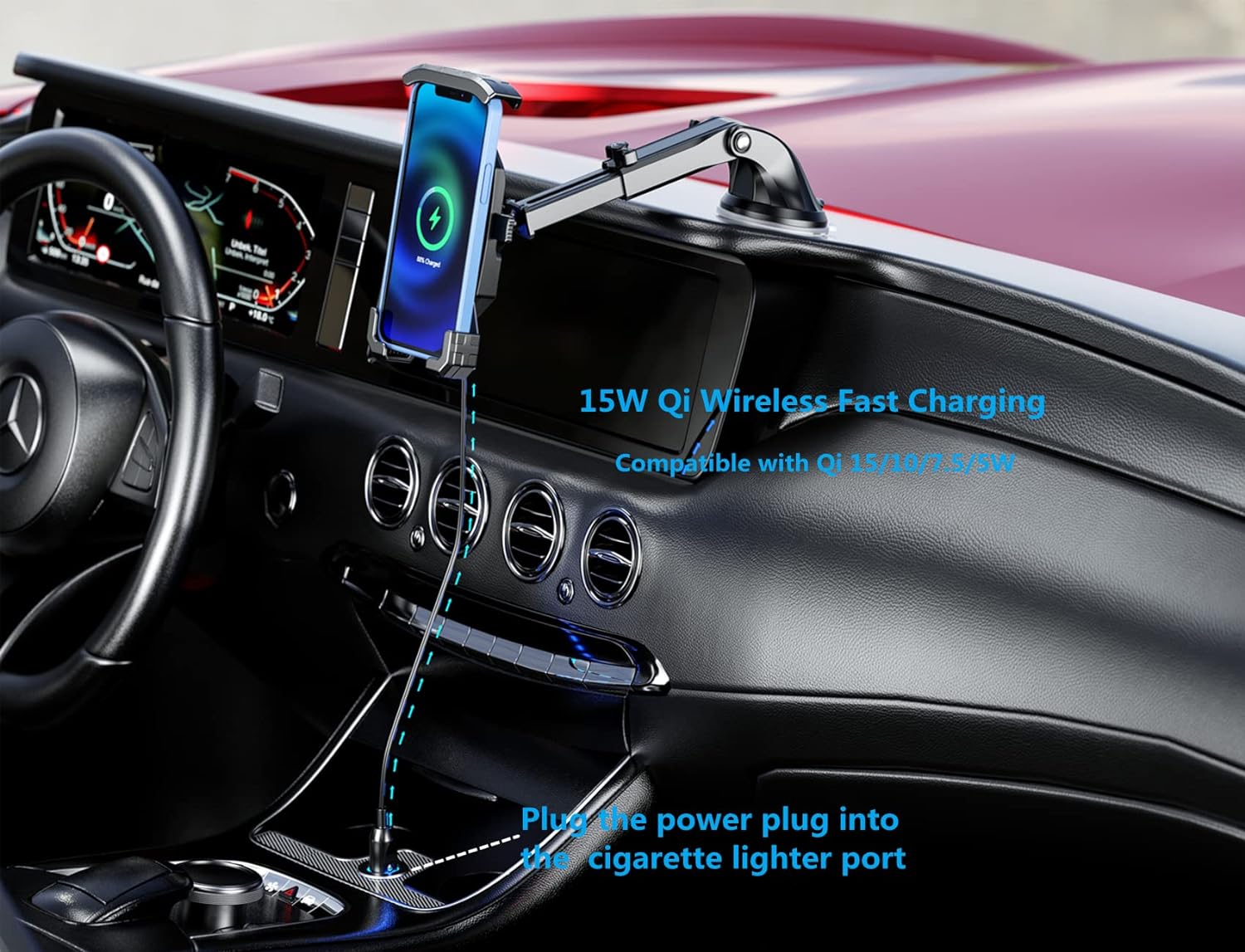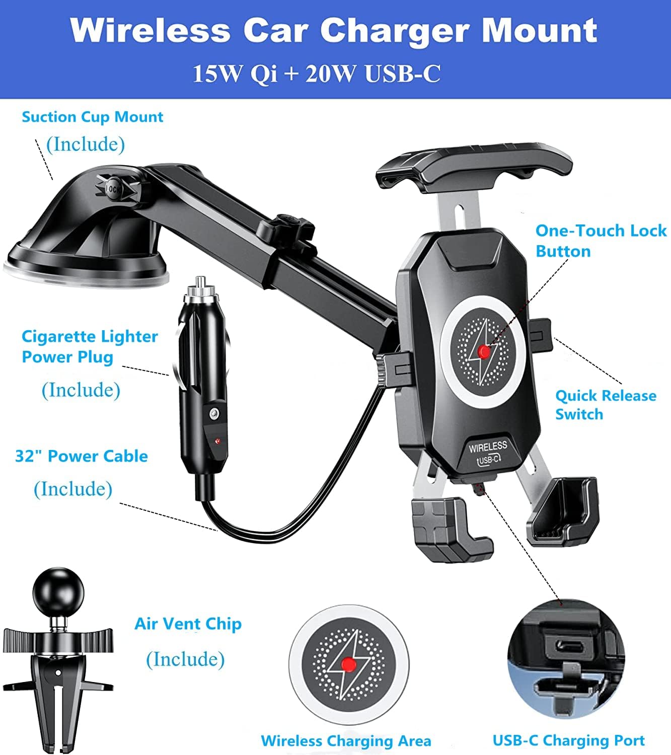 • 【Qi + PD 】Diese Qi 15W schnelle kabellose Handyhalterung Auto mit USB-C Ladeanschluss (max. Leistung bis zu 20W) und Zigarettenanzünderstecker. Der Stecker kann direkt in die Zigarettenanzünderbuchse des Autos gesteckt werden, um Strom zu erhalten