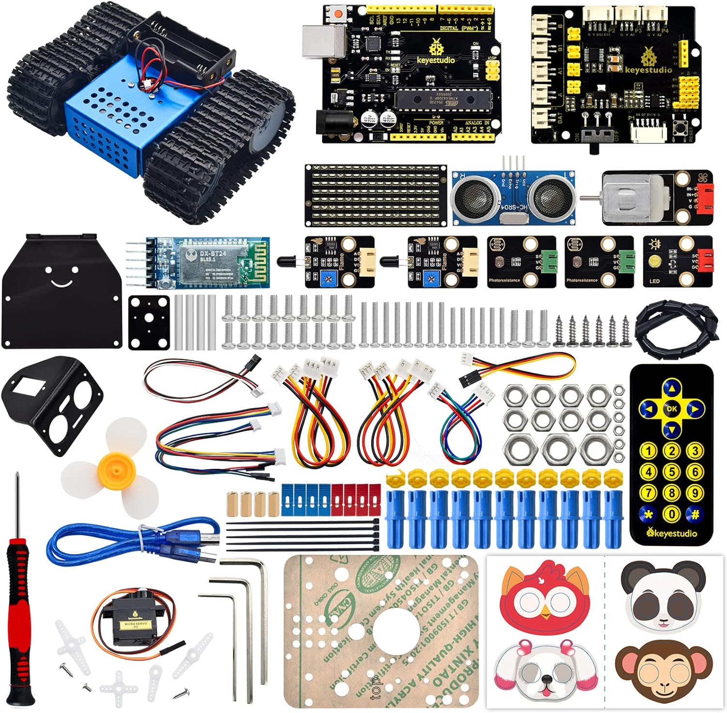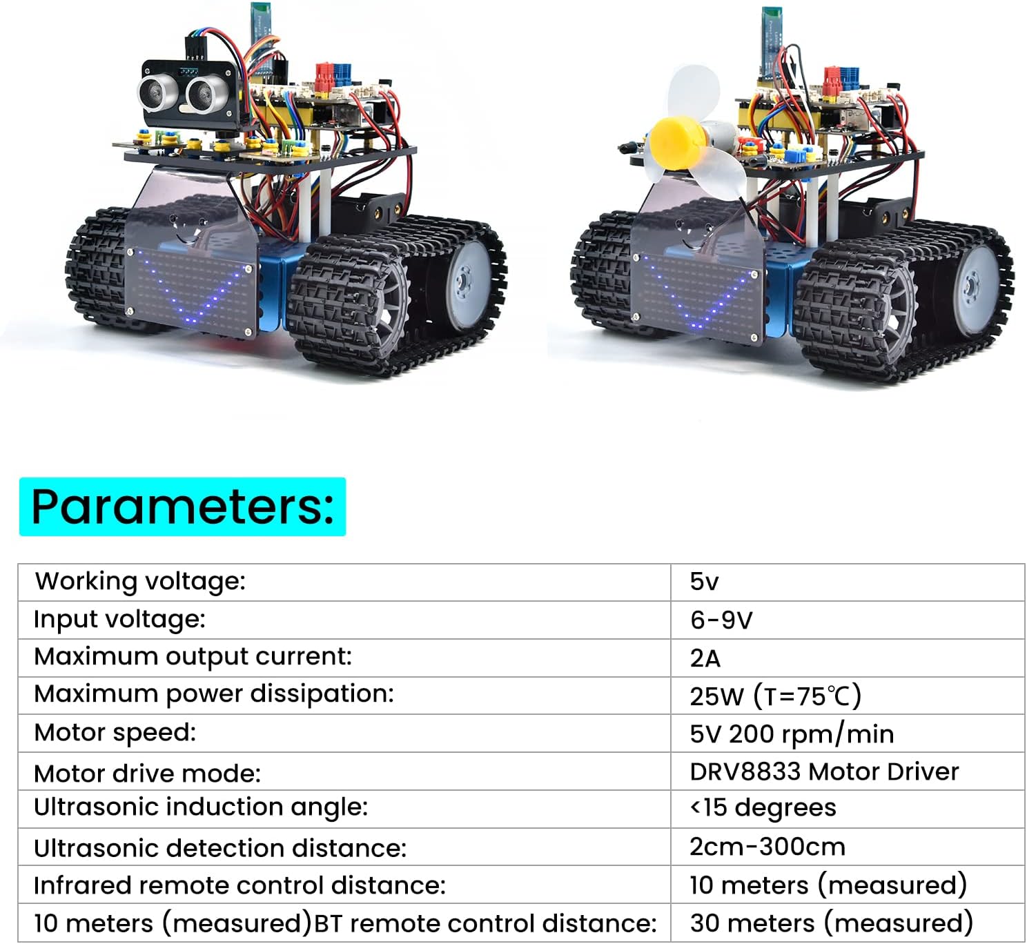 - 【Programmierung von Scratch und Arduino C】 Das STEM-Panzerroboter-Kit Zusätzlich zu den üblichen Funktionen der Linienverfolgung, Hindernisvermeidung und IR-Fernbedienung verfügt es auch über Motortreiber sowie Ultraschall-Entfernungsmessung und
