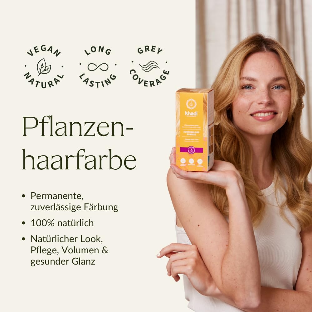 - PERMANENTE HAARFARBE: Lässt Dein Haar in einem warmen, kupfergoldenen Blond erstrahlen. Mit khadi Pflanzenhaarfarbe kannst Du Deine Haare dauerhaft färben, Deinen Ansatz behandeln oder Dir einfach einen neuen Farbton kreieren.